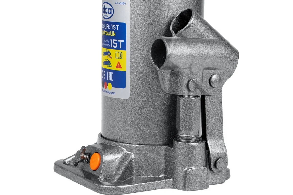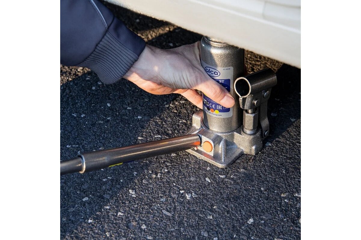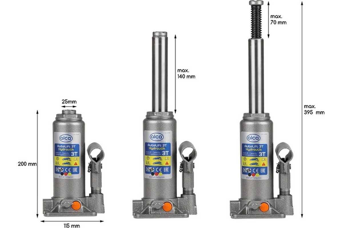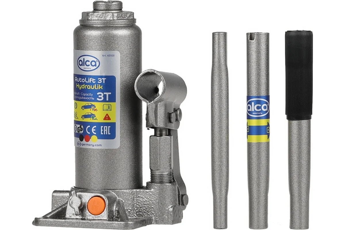 Аксессуары Alca Гидравлический бутылочный домкрат Alca предназначен для работы с грузами массой до 3 тонн. Он имеет продуманную конструкцию и очень удобен в обращении. Минимальная высота подхвата домкрата 195 мм, а максимальная высота подъема 380 мм. Alca можно использовать в качестве подъемного механизма при обслуживания легковых автомобилей, а также для строительных и такелажных работ.