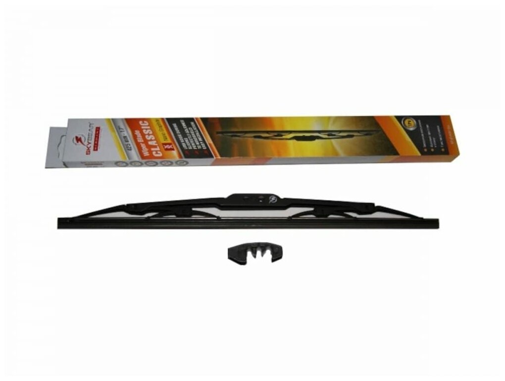 Щетка стеклоочистителя каркасная CLASSIC 17"/43 см SKYBEAR Использование традиционного корпуса позволило обеспечить беспрецедентно низкую цену при сохранении высоких эксплуатационных свойств. Бесшумное скольжение. Резинка на основе натурального каучука. Благодаря использованию классической схемы механизма прижима идеально прилегает к стеклу. Простая установка.