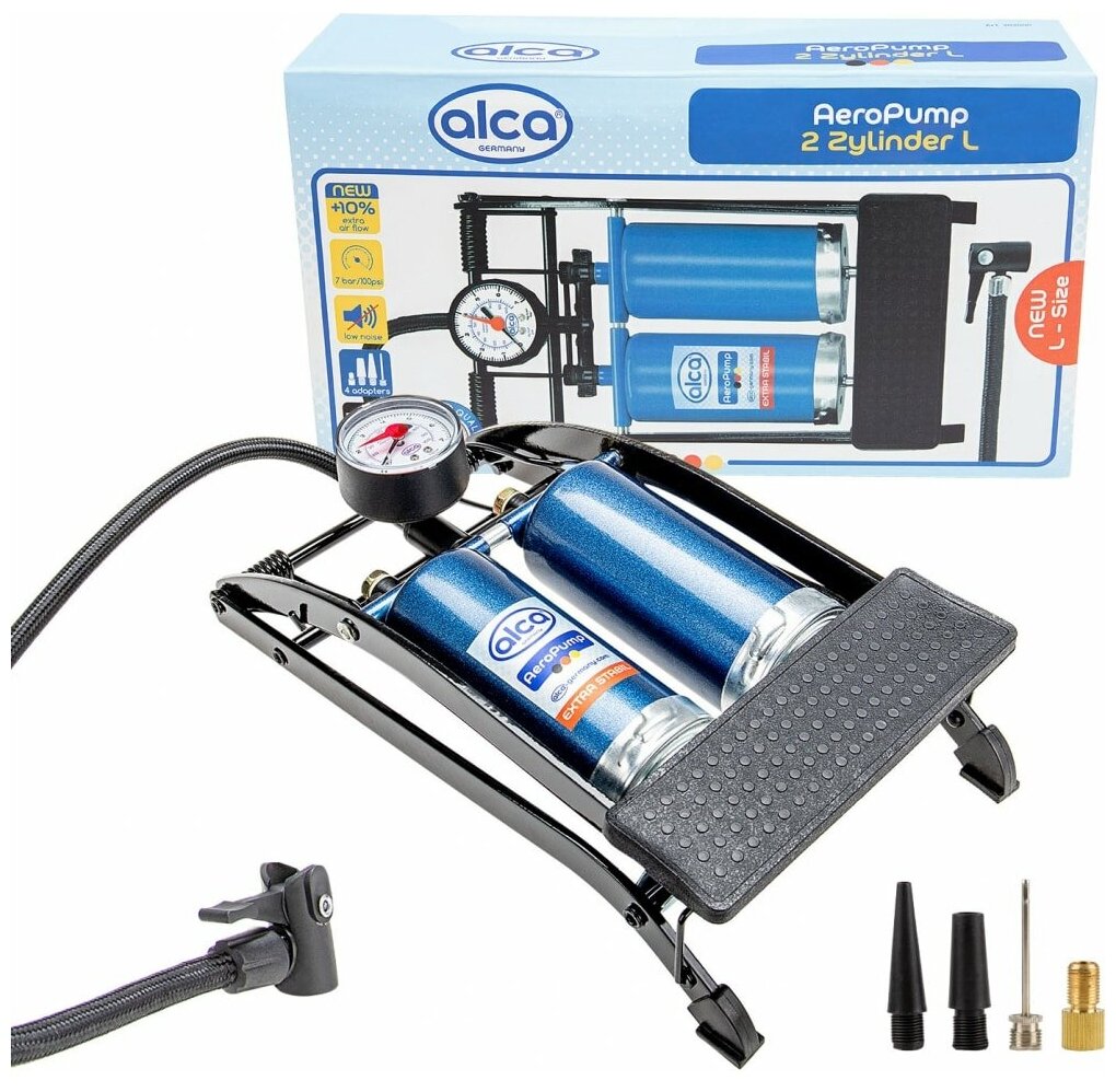 Насос ножной два цилиндра, 7 бар, с манометром, шланг 45 см., 4 адаптера для накачки шин автомобилей, мячей, велосипедов и т.д..