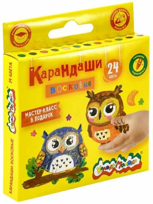 Набор восковых карандашей от бренда с позитивным названием Каляка-Маляка представлен специально для юных творческих детишек. В комплекте можно найти двадцать четыре карандаша разного цвета в бумажной обертке. В отличие от обычных карандашей, восковые помогут создать объемный цвет для будущих шедевров ребенка.