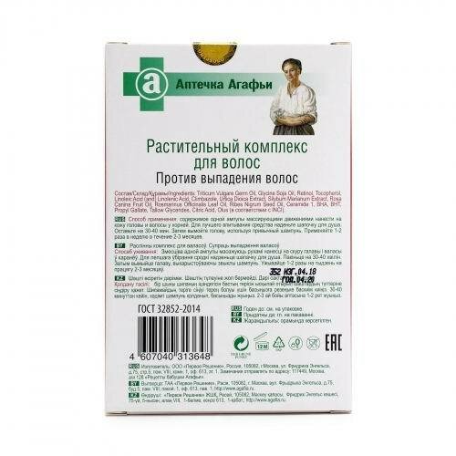 Хорошо известно, что причиной потери волос являются слабые корни. Поэтому единственно правильное решение, способное действительно помочь избавиться от этой проблемы – укрепить корни волос. Для этого и был создан масляный растительный комплекс в ампулах, который обладает повышенным укрепляющим действием. В каждой ампуле содержатся тщательно подобранные и сбалансированные активные вещества: масла зародышей пшеницы, шиповника, черной смородины, розмарина, соевое и репейное, масляные экстракты крапивы и расторопши, комплексы витаминов и антиоксидантов, растительные керамиды и климбазол. Использование этого комплекса против выпадения волос позволит эффективно оздоровить и укрепить их корни, а также обеспечит превосходный уход за кожной поверхностью головы, которая напитается влагой, освежится и пропитается приятным нежным ароматом. Рекомендуется применение этого растительного комплекса в ампулах с целью оздоровления и укрепления корней волос. Продукт прошел лабораторные испытания в ЦНИКВИ Минздрава России.