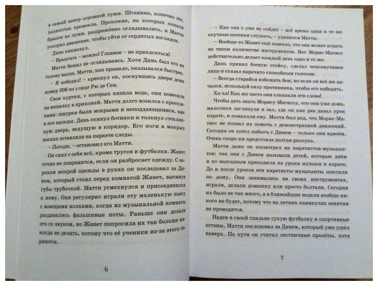 Книга очень "правильная". В ней нет отрицательных героев, борьбы со злом и несправедливостью. Матти, несмотря на то, что потерял родителей и живет в приемной семье, очень уравновешенный трезвомыслящий одиннадцатилетний мальчик. Для такого возраста это удивительно, мне все время казалось, что ему лет 14, когда он уже избавился от детской порывистости, непосредственности, спонтанности действий и высказываний. Но Матти как раз из тех французских детей, которые никогда не плюются едой - каждый день без напоминаний чистит зубы и прибирает свою комнату ) Его друг Динь, живущий с Матти в этой же комнате, более порывист и эмоционален, более разговорчив, но он замечательный друг, тонко чувствующий настроение Матти и умеющий ему помочь.
