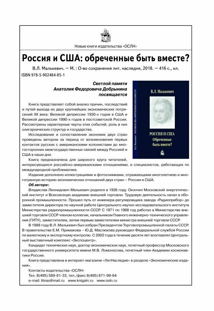 Россия и США. Обреченные быть вместе? (Малькевич Владислав Леонидович); Общество сохранения литературного наследия, 2018