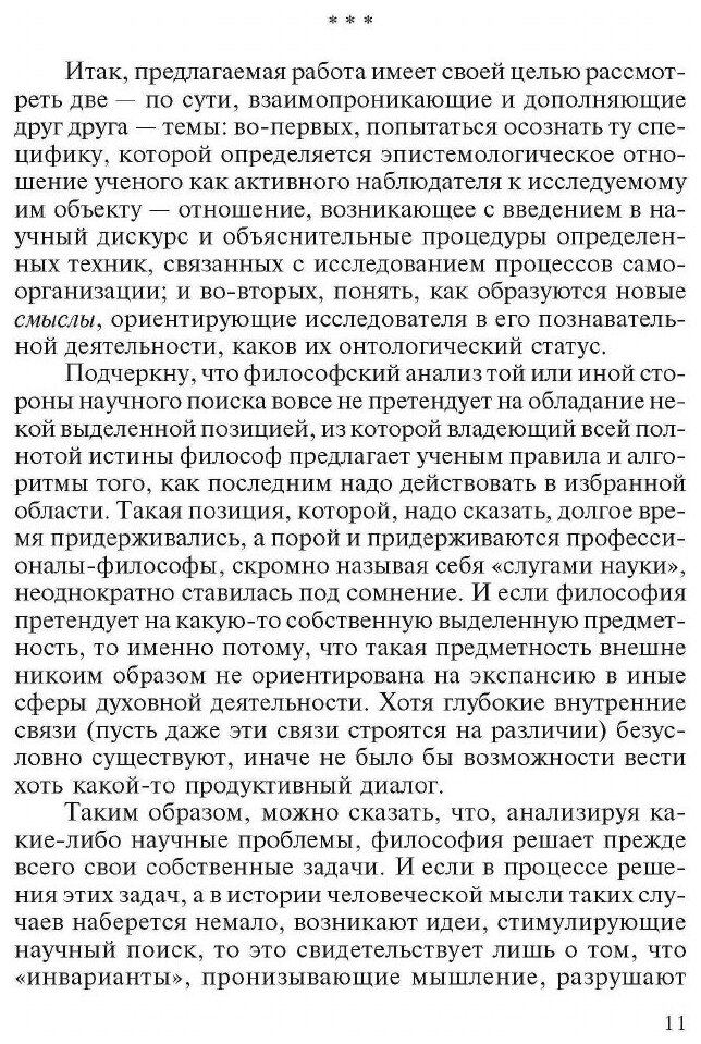 Книга посвящена актуальным философским проблемам естественнонаучного подхода к пониманию мироздания и, шире, общегуманитарным основаниям контакта человека с внешним миром и собственной внутренней природой. С опорой на базовые идеи междисциплинарного научного направления — синергетики, а также на постклассические философские технологии, выдвигается версия отношений между наблюдателем и наблюдаемым в научном познании, в свете которой рассматриваются онтологические основания теории самоорганизации, выстаиваются контуры конструктивной модели, позволяющей говорить о синтезе разнородных интеллектуальных и культурных формаций.