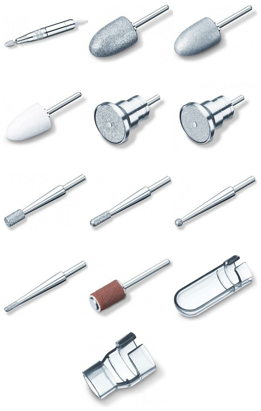 | Насадки | 10 (сапфировый конус мягкий, сапфировый конус жесткий, сапфировый диск мягкий, сапфировый диск жесткий, цилиндрическая насадка, бор в форме пламени, сапфировая насадка круглая, насадка в виде иглы, войлочный конус, основа для насадок с покрытием из наждачной бумаги), 30 одноразовых накладок из наждачной бумаги, защитный колпачок для ногтевой пыли |