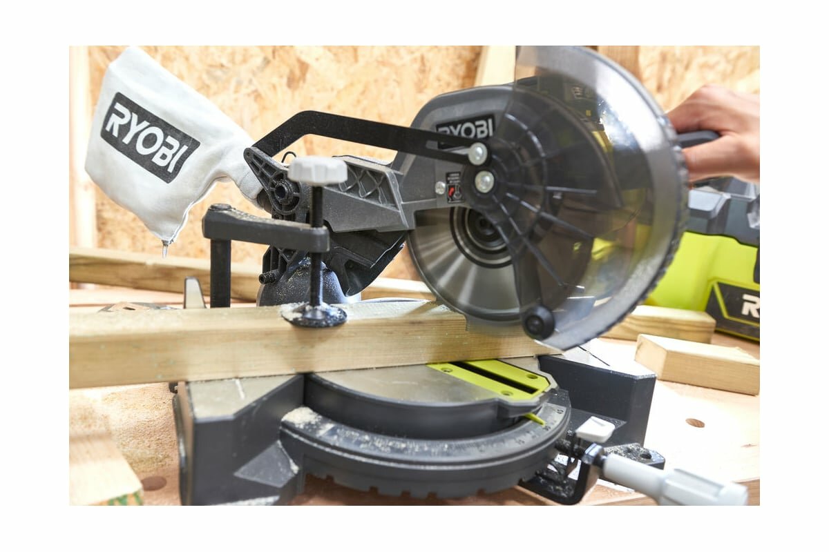 - EMS190DCL Ryobi ONE+ Аккумуляторная торцовая пила 18 В ONE+