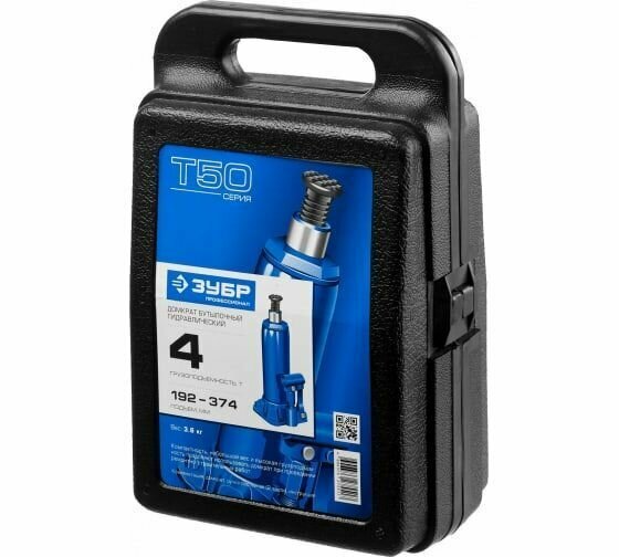 Гидравлический бутылочный домкрат 4т, 192-374мм, в кейсе ЗУБР T50 обладает хорошей грузоподъемностью, которая обеспечивает эффективную работу в автомастерской при обследовании подвески и ходовой автомобиля.