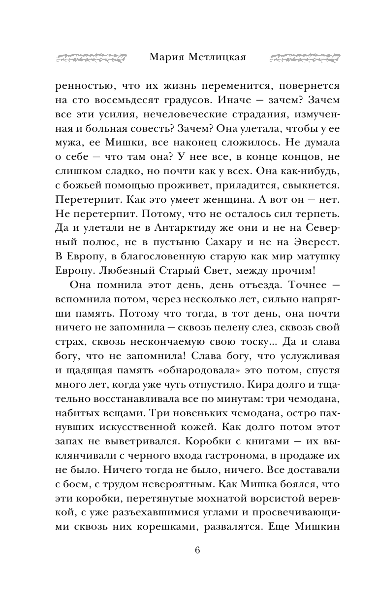 Не так давно Мария Метлицкая побывала в Риге и на радио рассказала о том , как она стала писательницей , автором пятнадцати опубликованных книг…Мне показалось интересным познакомиться с её новым опусом , хотя ни одна из книг этого автора моё внимание в книжном « Полярисе» раньше не привлекала. Принялся читать ознакомительный эпизод и увлёкся. Эмоционально. Точно. Жизненно. Узнаваемо. Реалистично. Вот что значит познакомиться с писательницей до самой книги. Подобная премедикация , оказывается, работает!