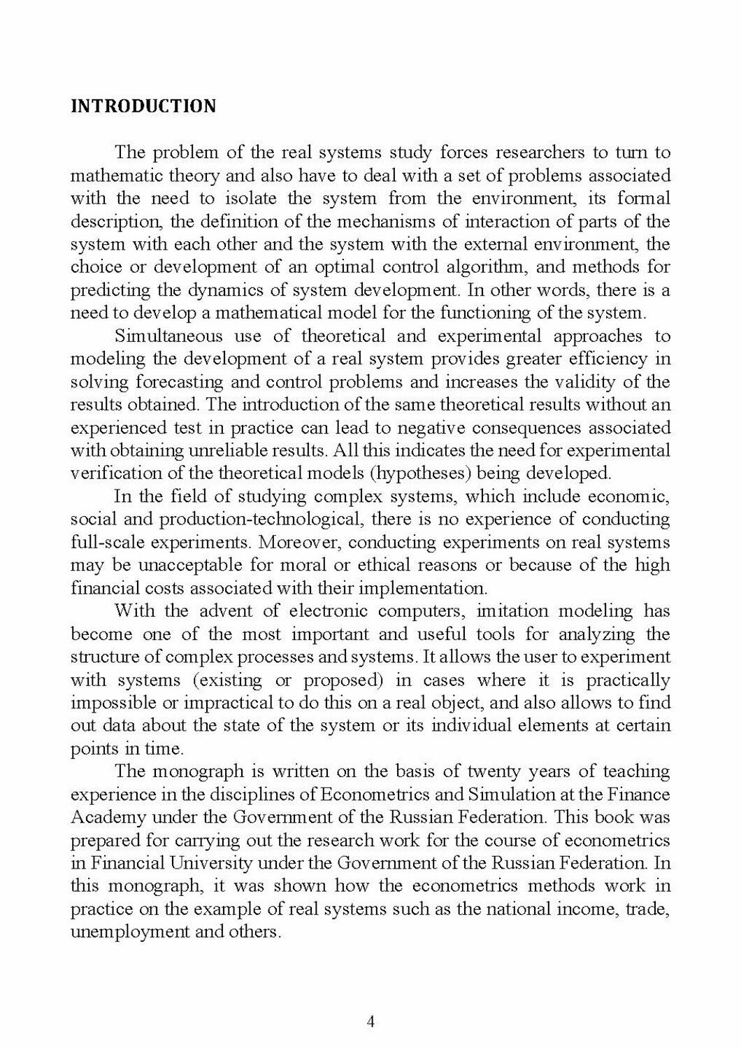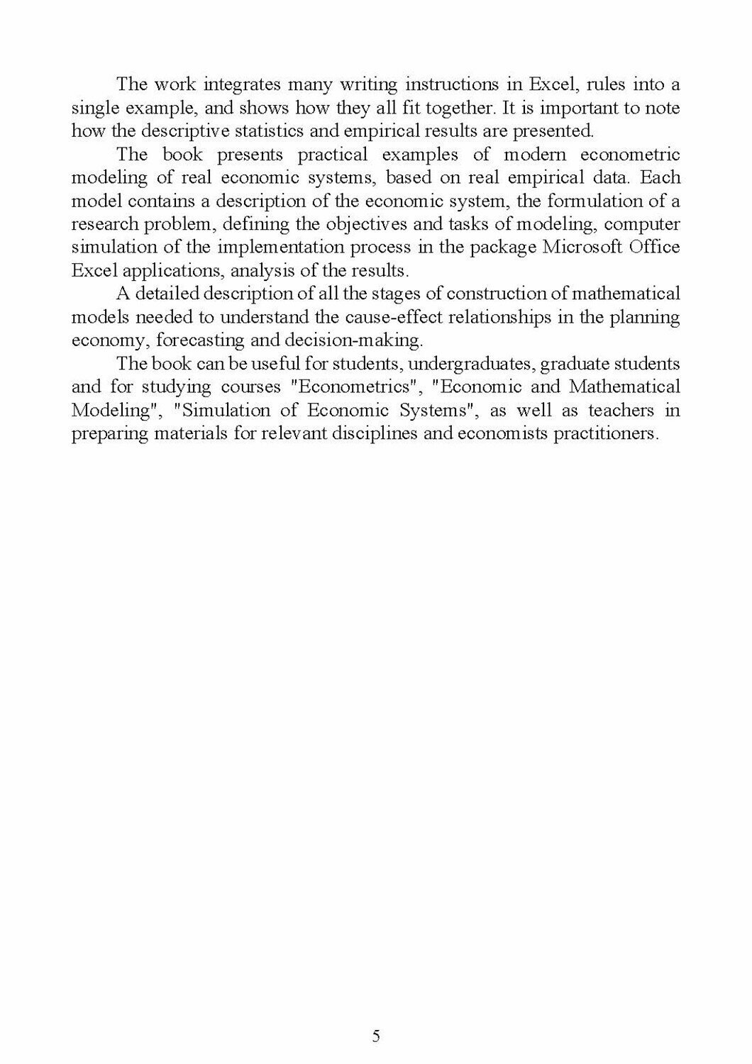 В монографии представлены современные практические примеры построения эконометрических моделей реальных экономических систем, которые будут полезны студентам при самостоятельном написании курсовых работ и домашних творческих работ по дисциплине «Эконометрика». Приводится подробное описание всех этапов построения моделей, необходимое для понимания причинно-следственных связей в экономике для планирования, прогнозирования и принятия решений. Модели реализованы на персональных компьютерах в пакете прикладных программ Microsoft Office Excel и EViews. Предназначена для студентов, обучающихся по направлению «Экономика» по программе «Международные финансы на английском языке».