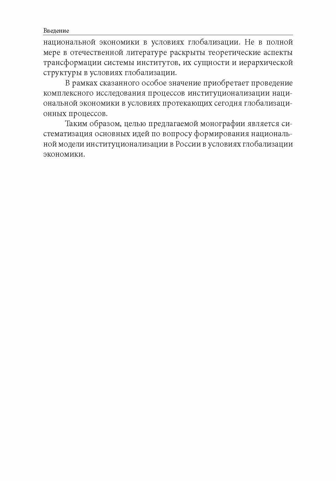 В монографии рассмотрены актуальные вопросы институционализации российской экономики в условиях глобализации. Цель автора состояла в систематизации основных идей по вопросу формирования национальной модели институционализации в России в условиях глобализации экономики. В работе раскрываются институциональные аспекты экономических отношений во взаимосвязи с глобализацией мировой экономики.
