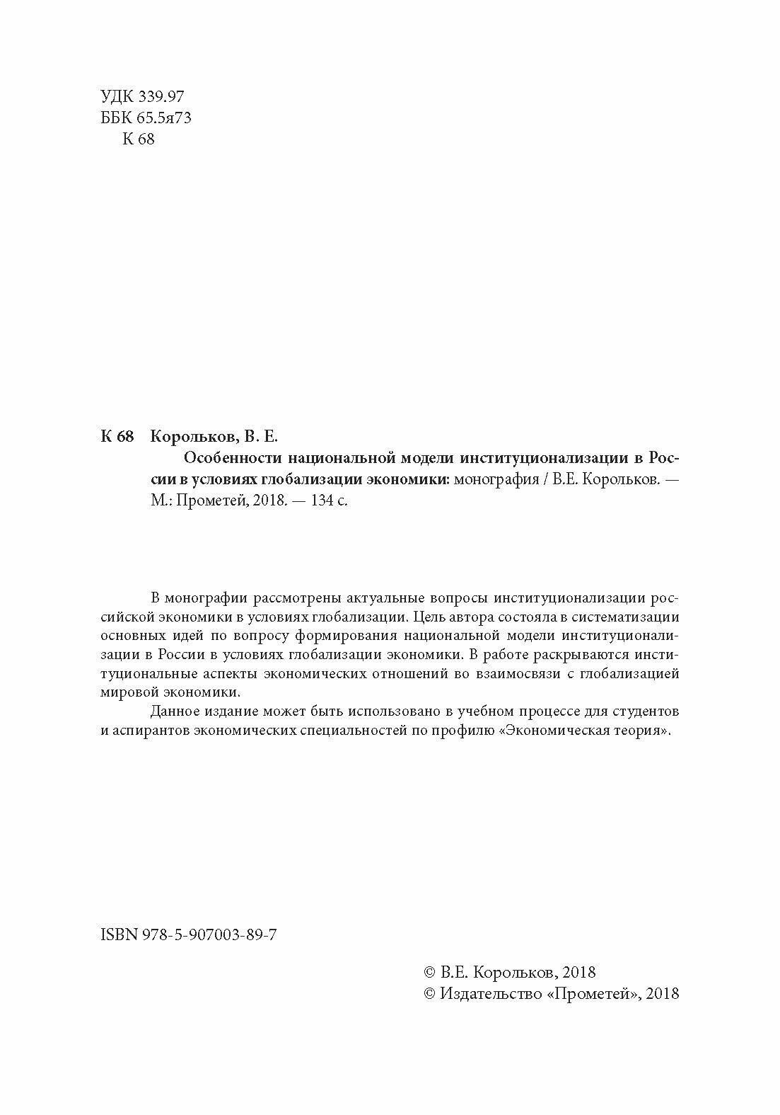 Особенности национальной модели институционализации в России в условиях глобализации экономики. Монография (Корольков Владимир Евгеньевич); Прометей, 2018