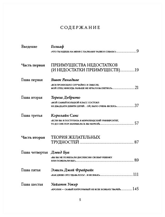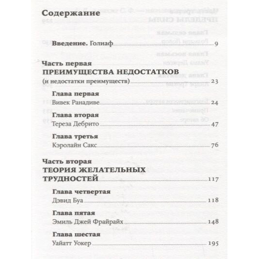 Автор мировых бестселлеров журналист The New Yorker Малкольм Гладуэлл, вдохновленный библейским противостоянием Давида и Голиафа, анализирует феномен победы слабого над сильным. В каждой из глав рассказывается история одного человека — знаменитого или неизвестного, заурядного или талантливого, — который, столкнувшись с, казалось бы, неразрешимыми проблемами, был вынужден действовать. Как быть: играть по правилам или довериться своим инстинктам? Сдаться или держаться до последнего? Нанести ответный удар или простить? Человек – существо адаптивное, но бывают такие ситуации, когда адаптация тождественна поражению. Поэтому стоит мобилизовать свои внутренние резервы: волю, ум, физические ресурсы, фантазию — и одержать верх над неблагоприятными обстоятельствами. Истории реальных людей, выстоявших в битве с могучими «голиафами» невероятных трудностей, показывают нам, что даже слабому может быть под силу вынести страшные удары судьбы и не только не сломаться, но и найти в себе силы для новых свершений.