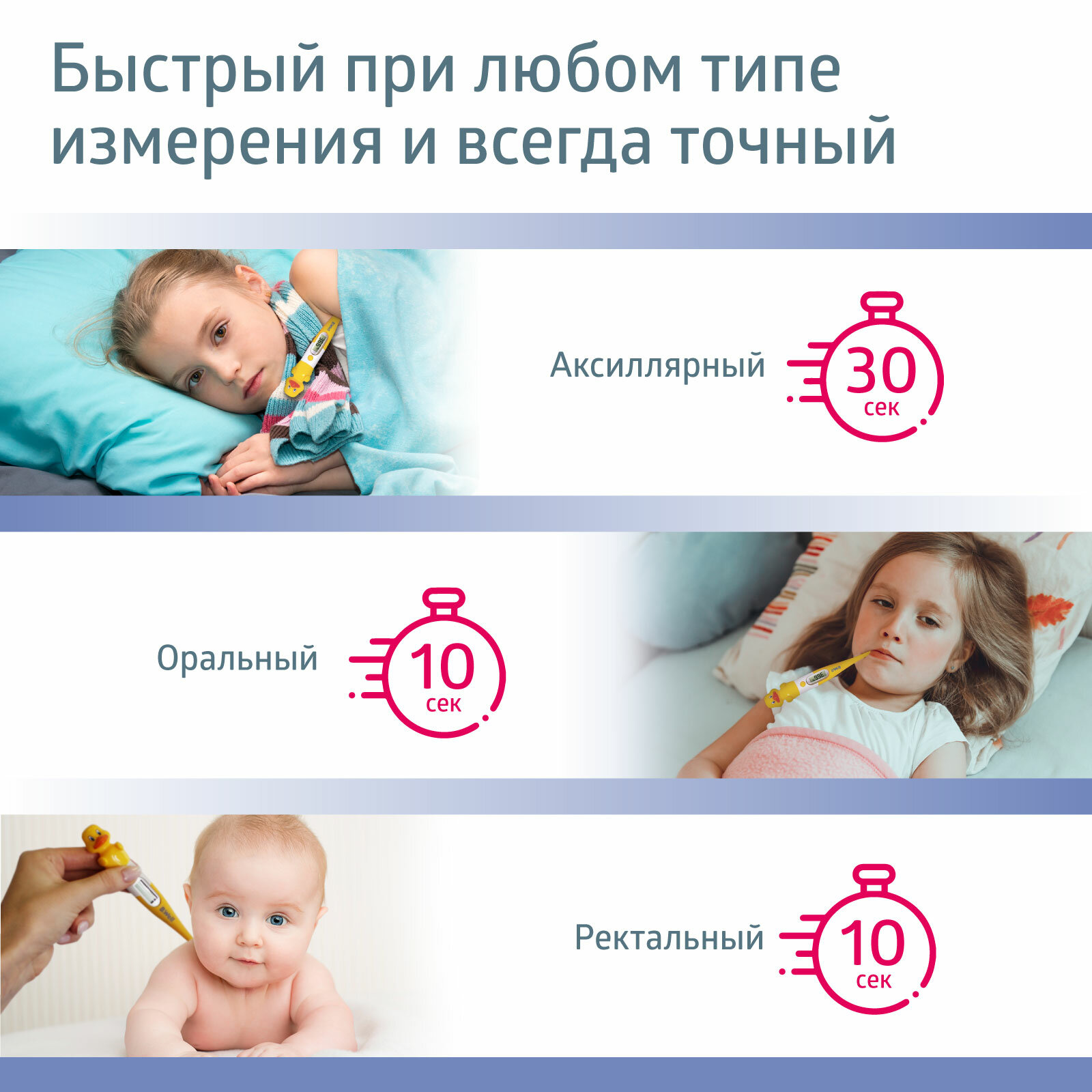 | Особенности | Яркий детский дизайн. Быстрое измерение от 6-ти секунд. Без ртути и стекла. Гибкий наконечник. Память последнего измерения. Автоматическое отключение. Влагонепроницаемый корпус. Специальный звуковой сигнал при повышенной температуре. Защитный футляр и батарейка в комплекте. |