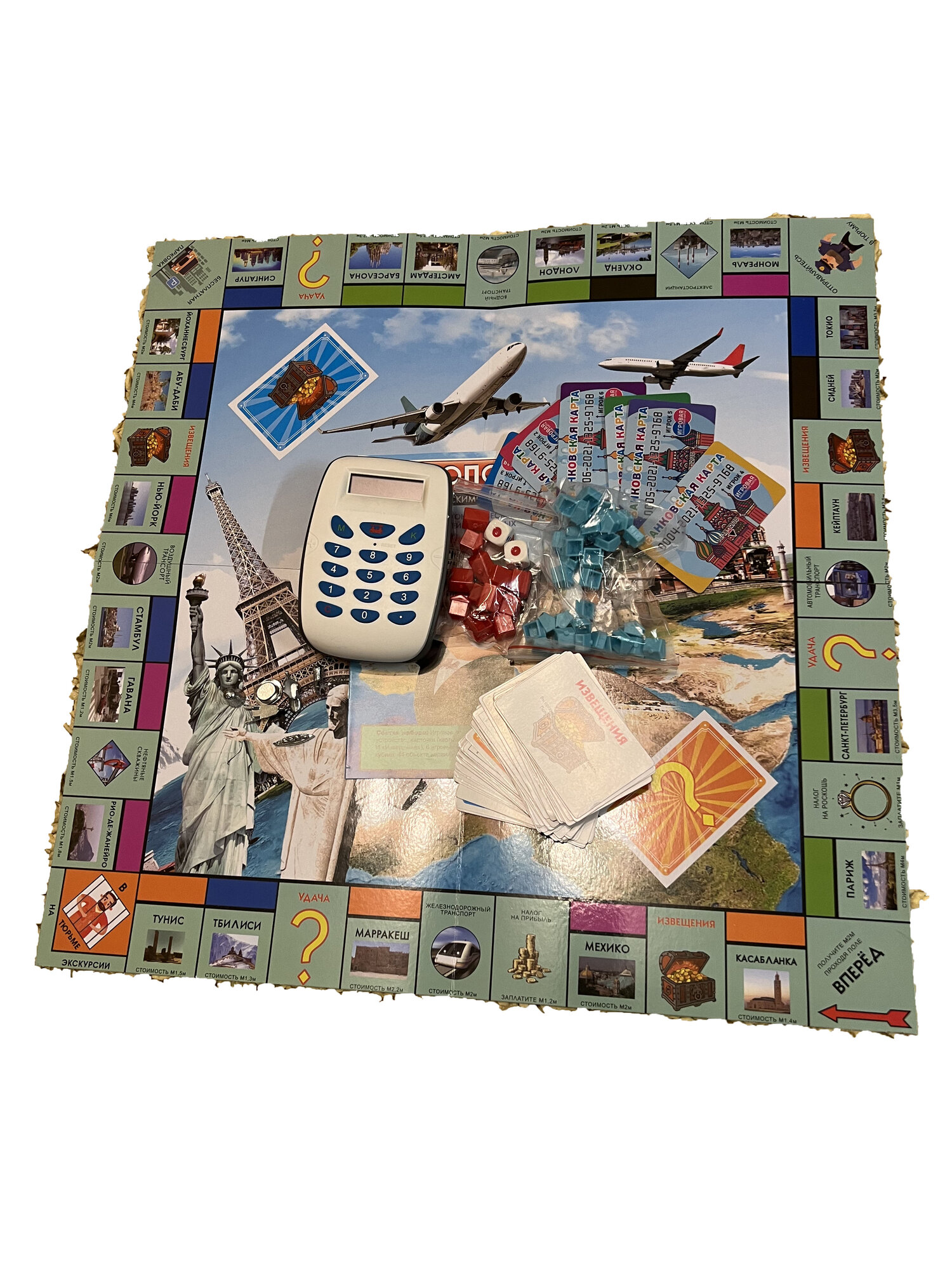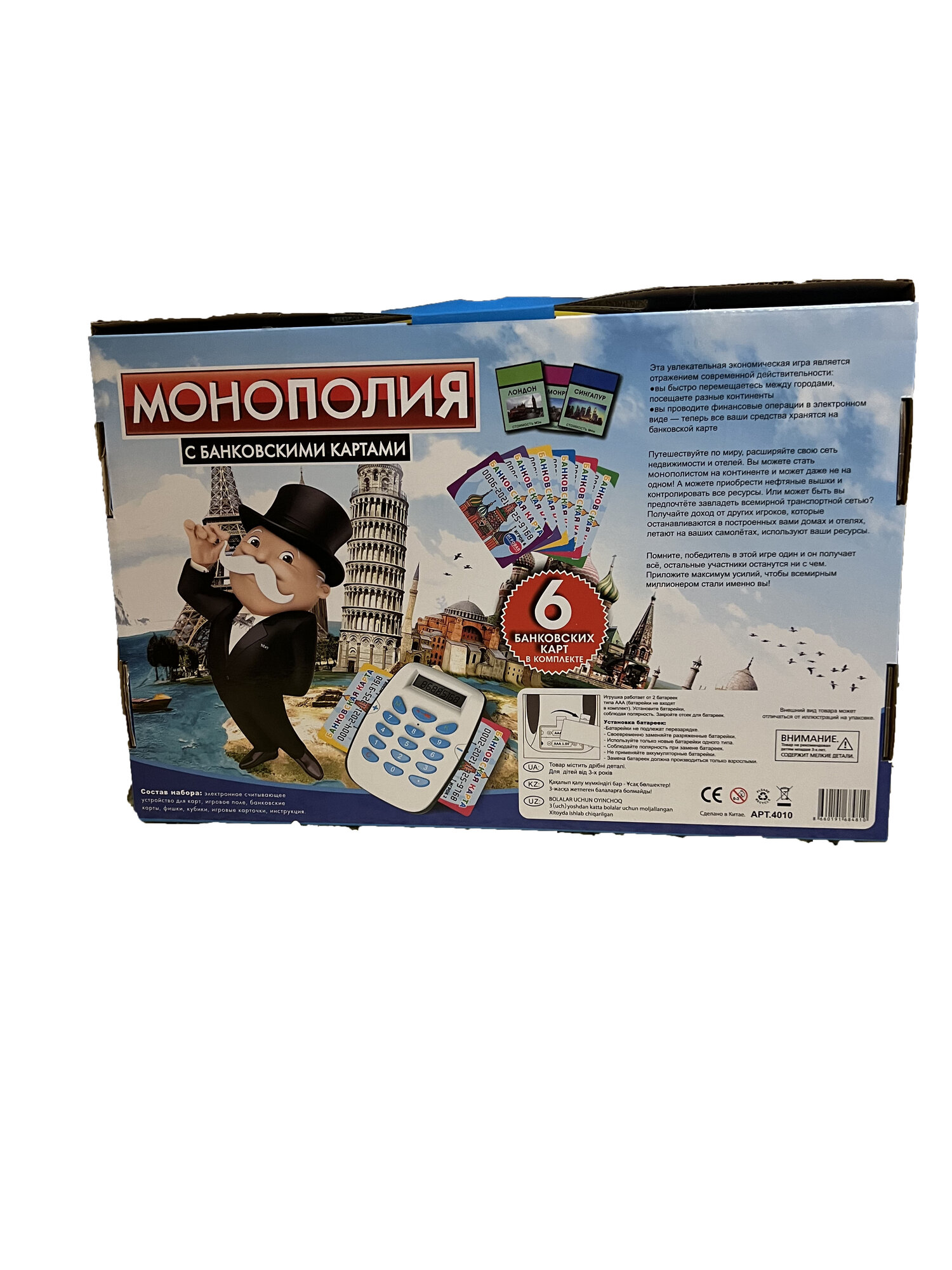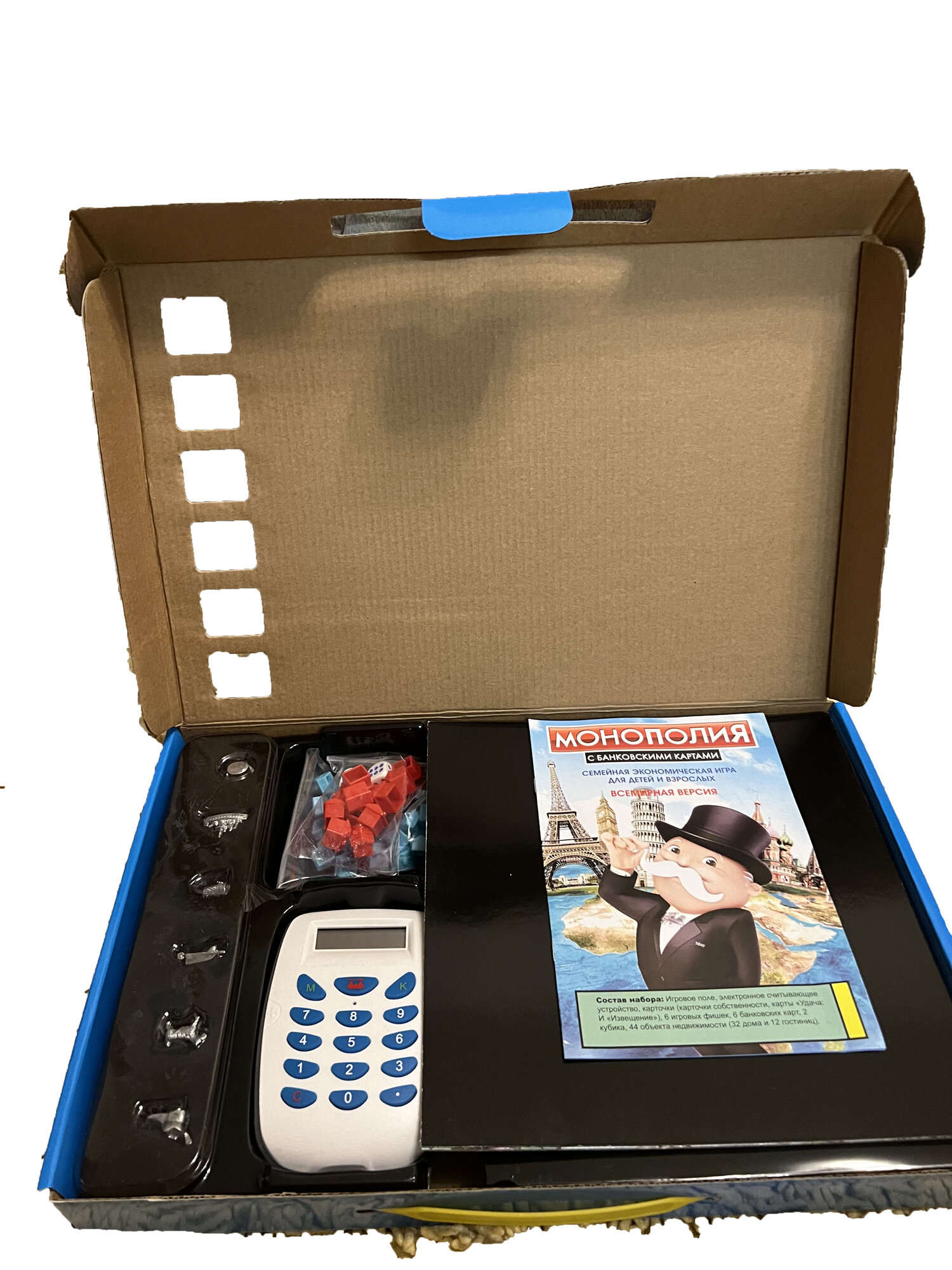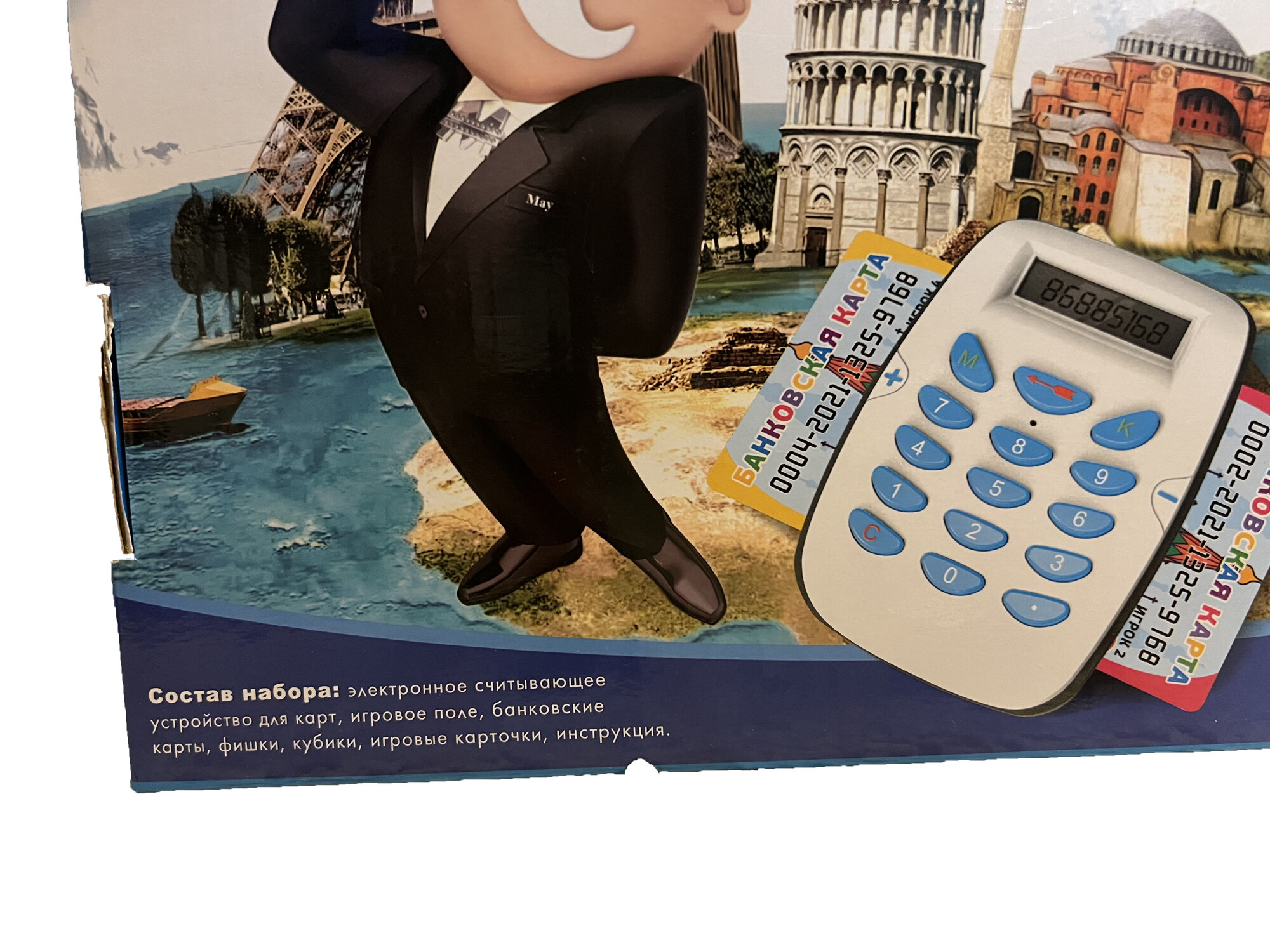 | Состав набора | игровое поле, 60 игровых карточек, 32 фишки дом, 12 фишек отель, 4 жетона, 2 кубика, электронный терминал, 4 электронные банковские карточки, инструкция |