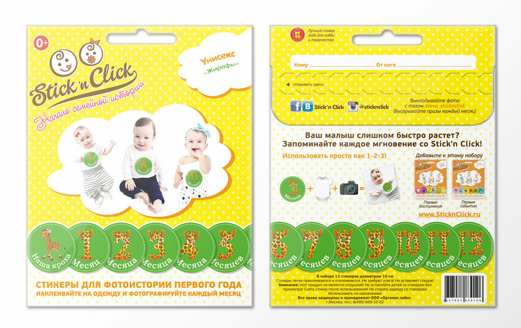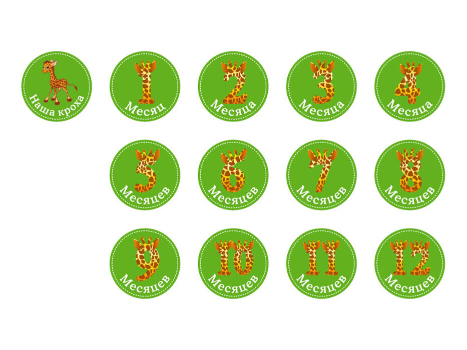 Серия ярких оригинальных наклеек Жирафы отлично подойдет и мальчикам и девочкам. Это забавный способ наблюдать как быстро растет Ваш малыш. Просто оденьте на вашего кроху белый бодик, наклейте нужный месяц и готово. Ваш малыш и Ваше креативное решение будут оценены по достоинству и станут объектом внимания и обсуждения. В наборе 13 оригинальных наклеек диаметром 10 см. на каждый месяц первого года крохи. Наклейки легко приклеиваются на одежду и также легко отклеиваются. Не требуют утюга! Не оставляют следов! Способ применения: Взять наклейку соответствующую месяцу малыша. Наклеить на бодик малыша. Сделать отличное фото. Поделиться с друзьями :-) Затем наклейку обязательно снять. Не оставляйте наклейку на малыше без присмотра. Не стирайте одежду с наклейкой.