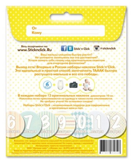 Серия нежных оригинальных наклеек Нежный Возраст подойдет и для мальчиков и для девочек. Это забавный способ наблюдать как быстро растет малыш. Просто оденьте на Вашего кроху бодик, наклейте нужный месяц и готово. Ваш малыш и Ваше креативное решение будут оценены по достоинству и станут объектом внимания и обсуждения. В наборе 13 оригинальных наклеек диаметром 10 см. на каждый месяц первого года крохи. Наклейки легко приклеиваются на одежду и также легко отклеиваются. Не требуют утюга! Не оставляют следов! Способ применения: Взять наклейку соответствующую месяцу малыша. Наклеить на бодик малыша. Сделать отличное фото. Поделиться с друзьями :-) Затем наклейку обязательно снять. Не оставляйте наклейку на малыше без присмотра. Не стирайте одежду с наклейкой.