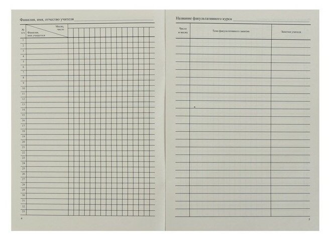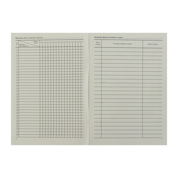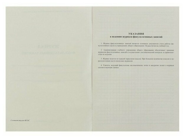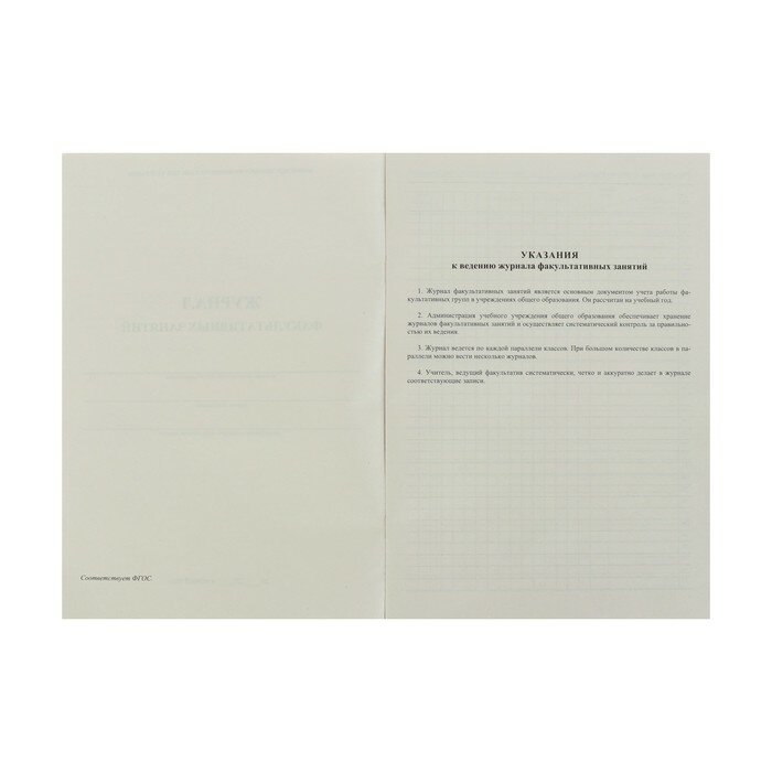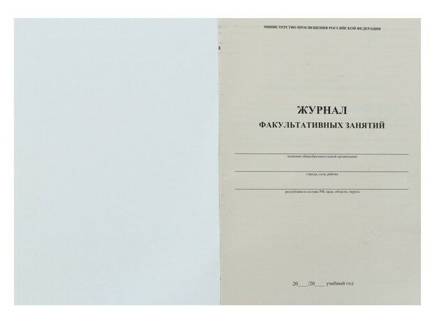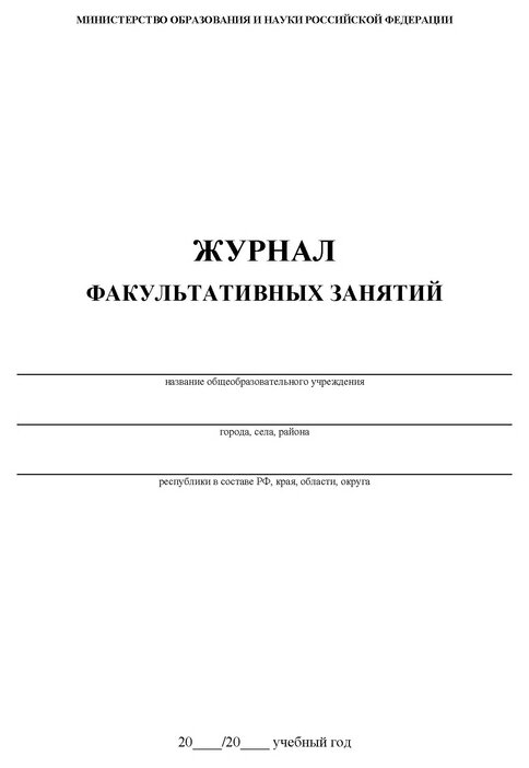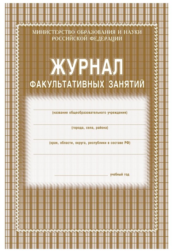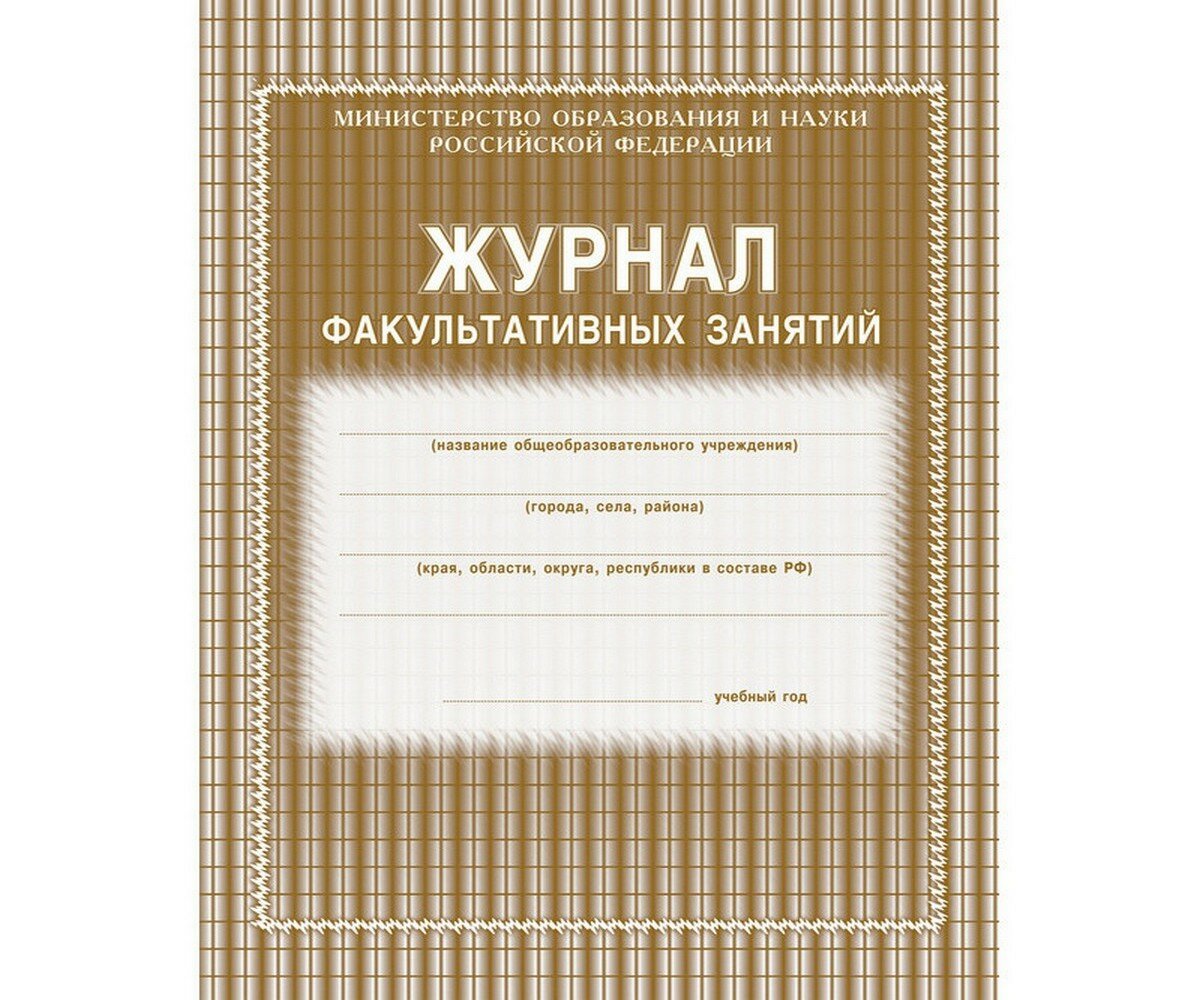 Журнал предназначен для учета работы факультативных групп и ведется в основных и средних общеобразовательных школах по каждому факультативу отдельно. Формат А4. Обложка выполнена в строгом стиле из мягкой цветной офсетной бумаги. Внутренний блок изготовлен из газетной бумаги, включает 48 страниц. Журнал построен по образцу классного журнала (ФИО ученика, колонки для отметок и т.д.).