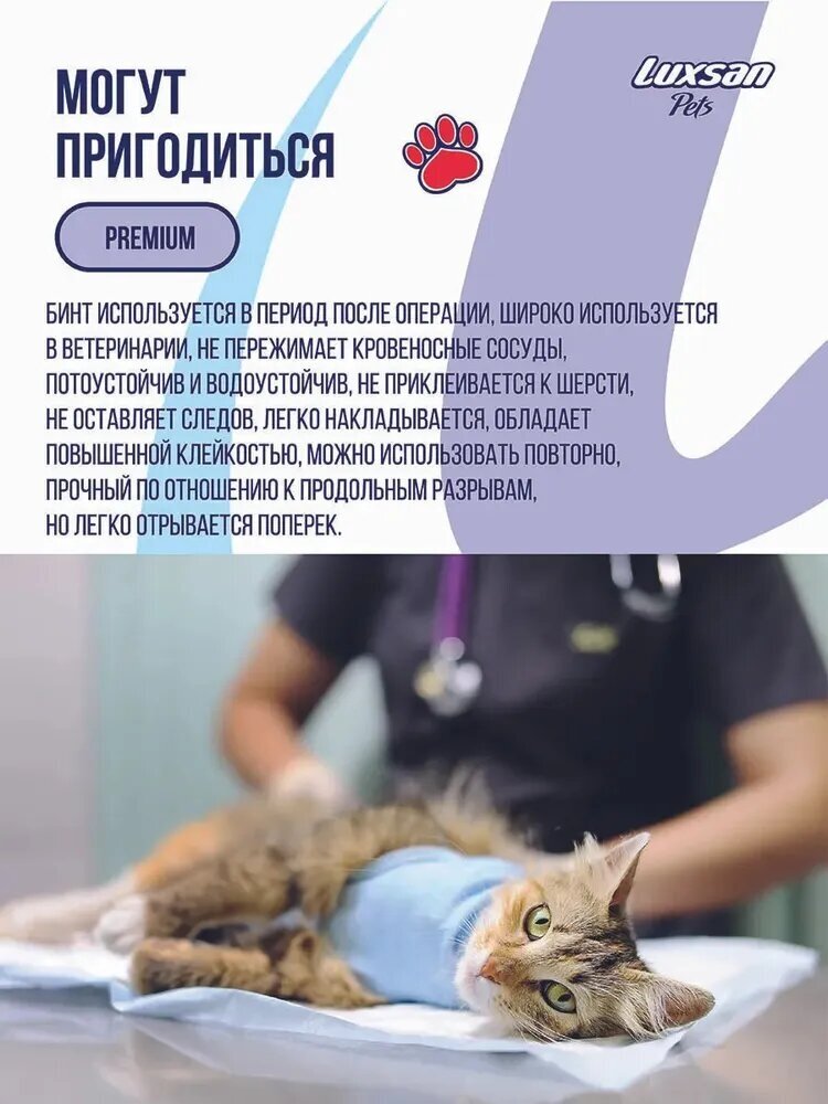 Бинт эластичный и надежно фиксируется между слоями и на теле животного. Горькая пропитка предотвращает снятие бинта вашим питомцем. Изделие воздухопроницаемо и влагонепроницаемо, что обеспечивает защиту от грязи и влаги.