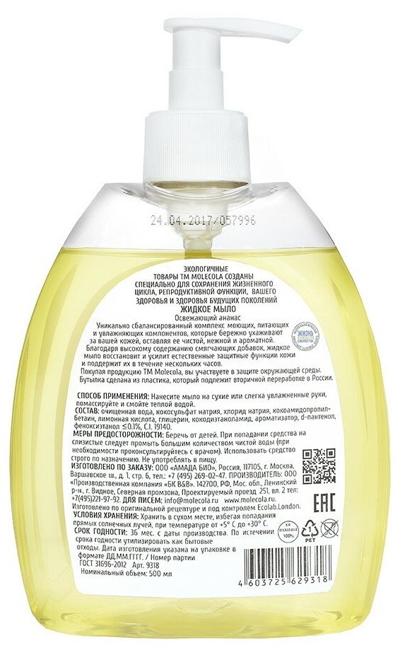 Экологичное жидкое мыло для рук Освежающий ананас уникально сбалансированный комплекс моющих, питающих и увлажняющих компонентов, которые бережно ухаживают за вашей кожей, оставляя ее чистой, нежной и ароматной. Благодаря высокому содержанию смягчающих добавок, жидкое крем-мыло восстановит и усилит естественные защитные функции кожи и поддержит их в течение нескольких часов. Данный товар имеет маркировку ЭКО.