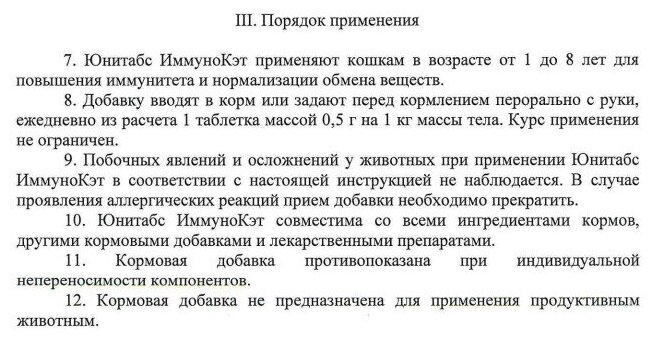 Юнитабс ИммуноКэт применяют кошкам в возрасте от 1 до 8 лет для повышения иммунитета и нормализации обмена веществ. Добавку вводят в корм или задают перед кормлением перорально с руки, ежедневно из расчета 1 таблетка массой 0,5 г на 1 кг массы тела.