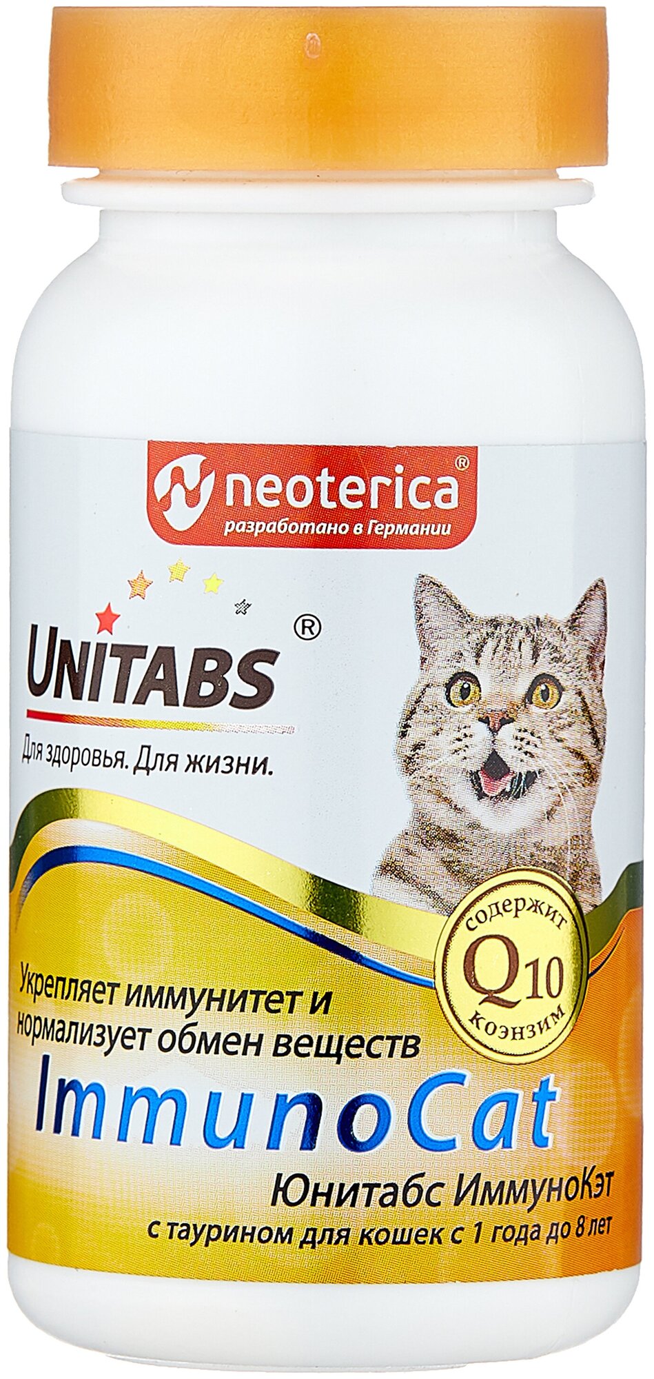 Unitabs – это серия витаминно-минеральных комплексов для собак всех возрастов и пород, которые содержат коэнзим Q10 и все необходимые витамины, макро- и микроэлементы. ImmunoCat с таурином для кошек с 1 года до 8 лет, 120 таб. Укрепляет иммунную систему. Восполняет баланс витаминов, макро- и микроэлементов. Нормализует обмен веществ.