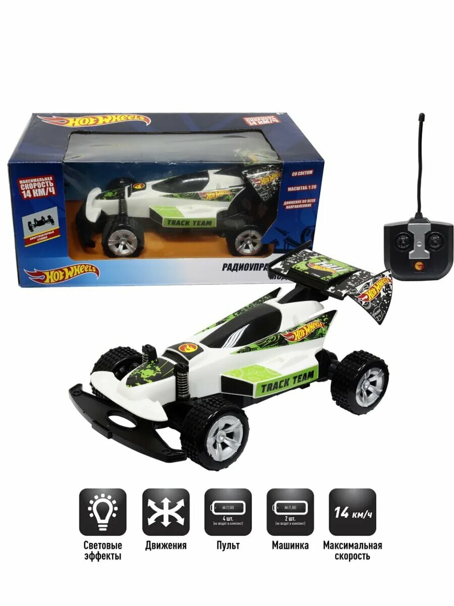 Багги на радиоуправлении, выполненная по популярной лицензии Hot Wheels. Машина обладает ярким стильным дизайном, отличными ездовыми характеристиками и развивает скорость до 14 км/ч. Такая игрушка станет замечательным подарком для каждого любителя техники. Ваш ребенок с радостью будет управлять этим отличным миниатюрным автомобилем при помощи специального пульта.