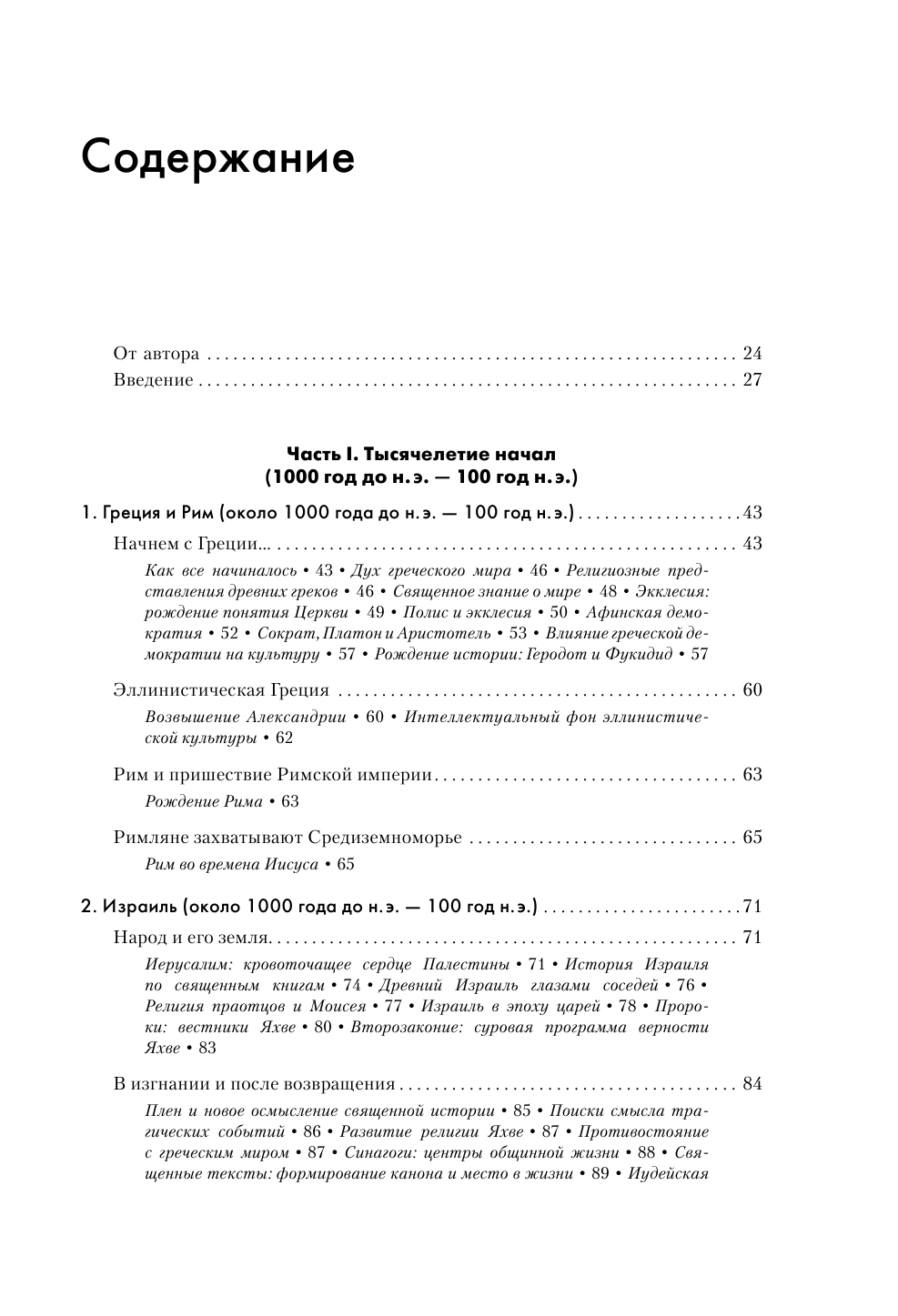 Ещё одно интересное «новшество». Все знают, что христианству две тысячи лет, однако в названии книги речь идёт о трёх тысячах лет истории. В чём же дело? Автор отстаивает точку зрения, что корни христианства не только в проповеди Христа и Ранней Церкви, но во всей иудейской истории и антично-эллинистической культуре. И, по большому счёту, это так. Ведь без иудейской цивилизации и книг Ветхого Завета не было бы и христианства, а без эллинизма и греко-римской культуры не было бы христианства таким, каким мы его знаем. Именно поэтому начальные главы книги кратко освещают историю последнего «дохристианского» тысячелетия.