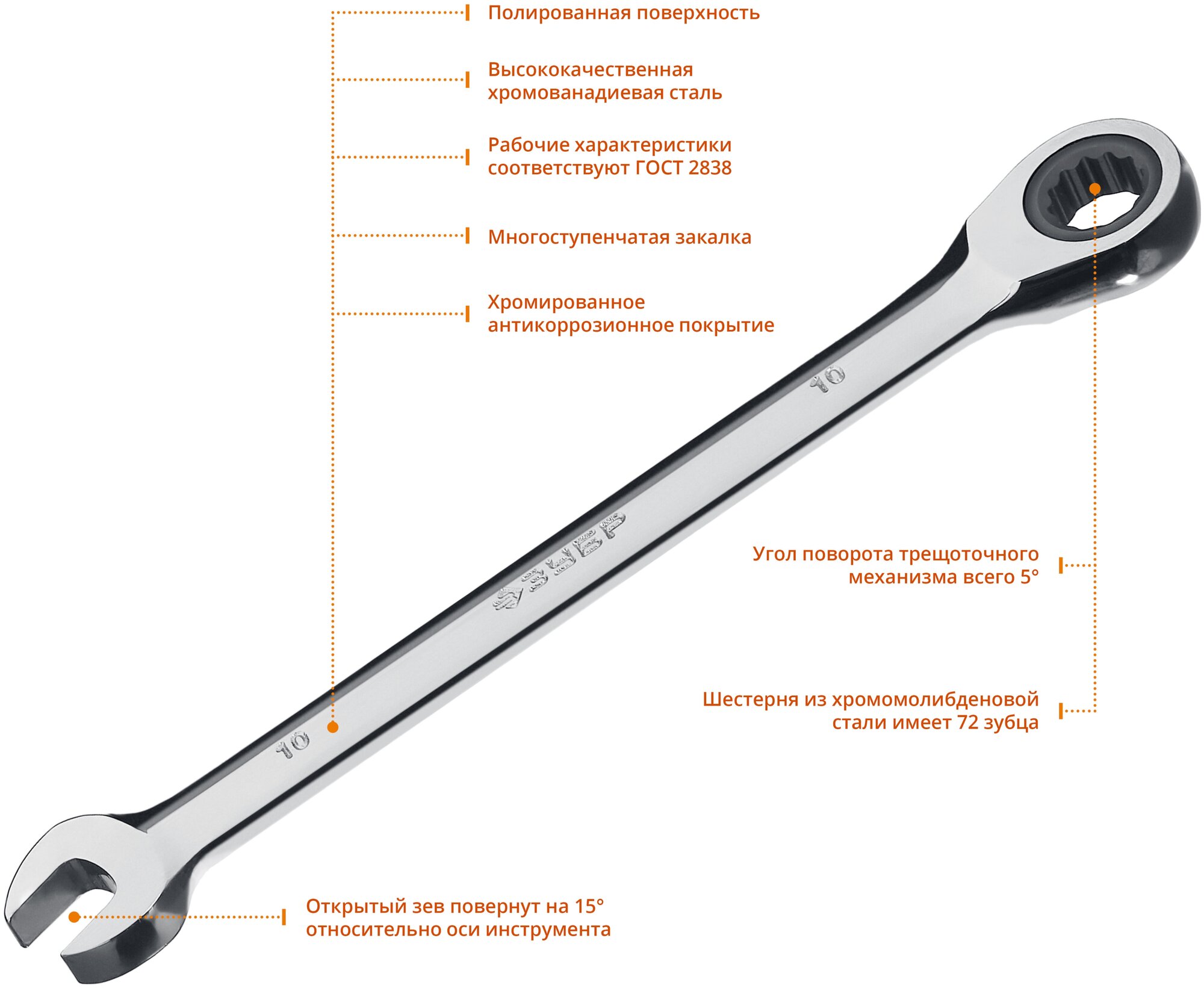 Профессиональные ключи – изготавливаются из хромованадиевой стали методом ковки и последующей холодной штамповки, закалены, имеют стойкое хромированное покрытие. Проходят прецизионную механическую обработку, благодаря чему достигаются максимальные ресурс и геометрическая точность. Соответствуют госту и стандарту DIN. Наилучший выбор для промышленного применения.ПреимуществаКлючи изготовлены из высококачественной хромованадиевой стали с многоступенчатой закалкой для увеличения ресурса ключей, а также обладают надежным хромированным покрытием для защиты от коррозии. Рожковым зевом можно работать с крепежом, даже когда доступ к нему открыт только с одной стороны и нет возможности накинуть ключ на крепежный элемент. Зев расположен под углом 15 градусов к оси рукоятки, для работ в труднодоступных местах. При работе трещоточным ключом угол поворота составляет всего 5 градусов, что позволяет работать в труднодоступных местах без необходимости перезахвата крепежа