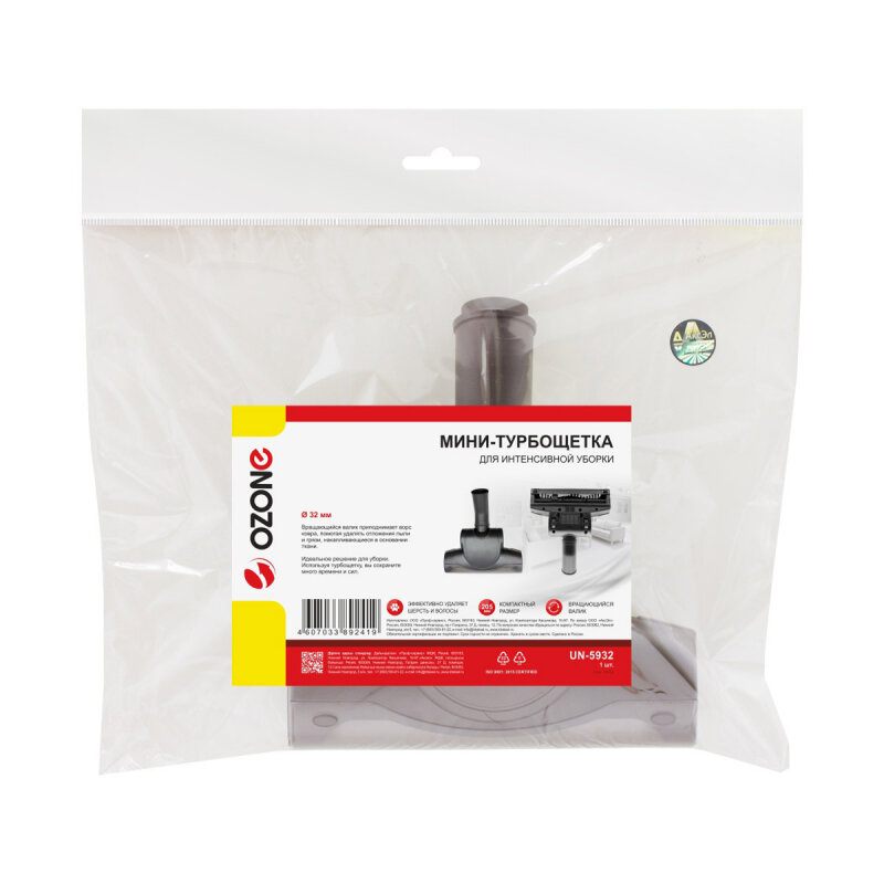 Турбощетка для интенсивной уборки OZONE (под трубку 32 мм) ширина рабочей зоны 205 мм. Мини-турбощетка для интенсивной уборки для бытового пылесоса. Обеспечивает эффективную обработку поверхности, профессиональное удаление сложных загрязнений и шерсти домашних животных. Ширина рабочей зоны 205 мм. Подходит для пылесосов с диаметром удлинительных трубок 32 мм