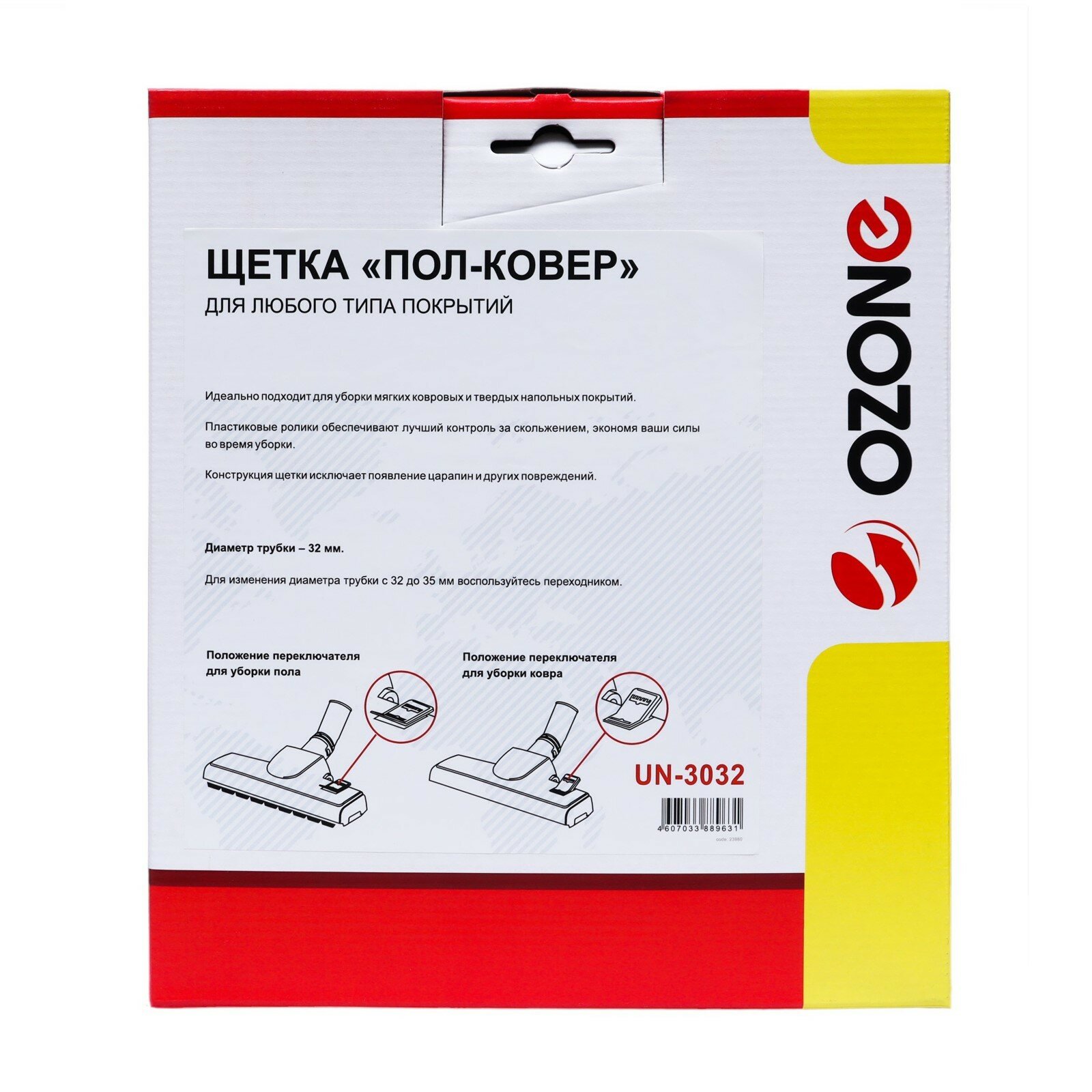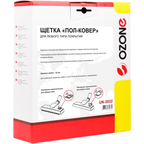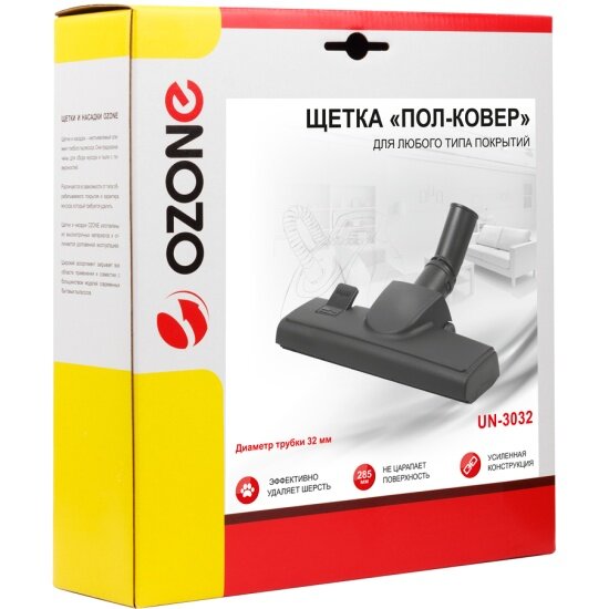 OZONE Высокоэффективная щетка "Пол-Ковер" с удлиненной поверхностью рабочей зоны Максимальная эффективность всасывания, удобный ножной переключатель режима работы пол-ковер, удлиненная рабочая поверхность, держатель для пылесоса,дополнительные ролики в рабочей зоне подошвы Подходит для всех типов пылесосов с диаметром удлинительных трубок 32 мм.