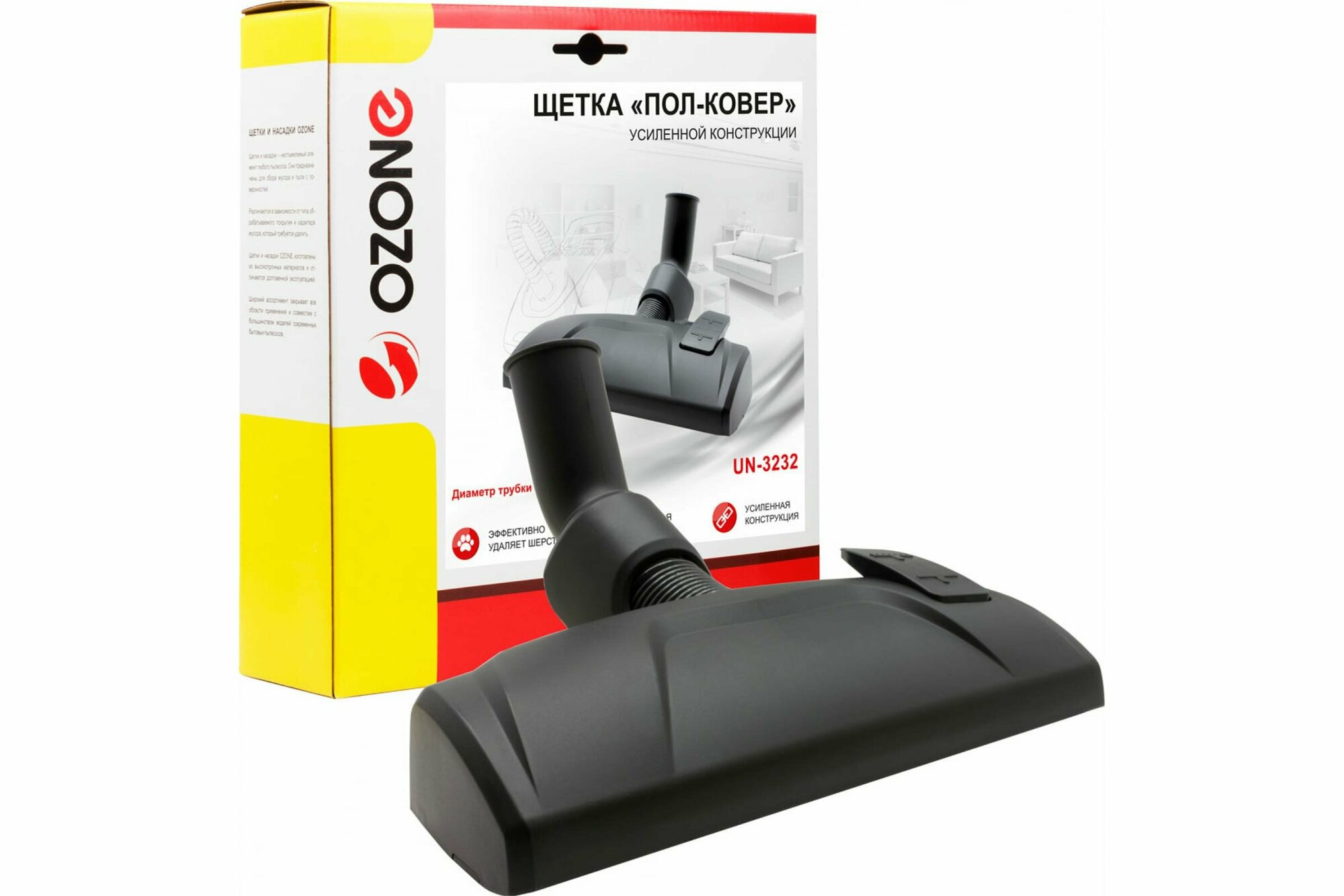 OZONE UN-32 Универсальная высокоэффективная щетка "Пол-Ковер". Максимальная эффективность всасывания на неровных поверхностях, удобный ножной переключатель режима работы пол-ковер, держатель для пылесоса, дополнительные ролики в рабочей зоне подошвы. Подходит для пылесосов с диаметром трубки от 32 мм Переключатель режима уборки Позволяет убирать как гладкие поверхности (паркет, ламинат), так и ковровые покрытия. Установите переключатель в положение, соответствующее типу поверхности.