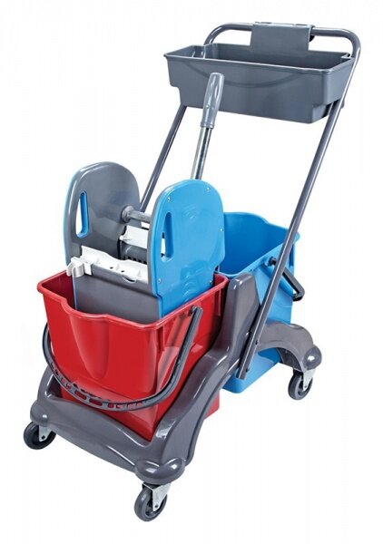 Двухведерная уборочная тележка с вертикальным отжимом для плоских мопов. Пластиковый каркас. Ударопрочный пластик. Перекидная ручка. Корзинка для химии.