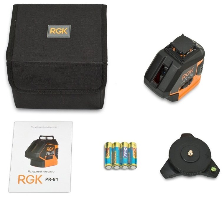 | Описание | Лазерный нивелир RGK PR-81 – универсальный прибор для разметки в помещениях и на улице. Диапазон работы лазера составляет 40 метров, с приемником – 80 метров.,Особенности лазерного уровня RGK PR-81,• Две лазерных плоскости:горизонтальная с углом развертки 360°, вертикальная 120°.,• Точность построения ±2 мм на 10 метров.,• Автоматическое самовыравнивание в диапазоне ±4°.,• Импульсный режим для работы с приемником.,• Функция блокировки компенсатора для построения наклонных плоскостей.,• Два крепления под штатив 1/4'' и 5/8''.,При включении лазерного нивелира RGK PR-81 автоматически срабатывает магнитный компенсатор и проецируются обе плоскости:горизонтальная и вертикальная. Для удобства работы или для экономии заряда аккумулятора ненужную проекцию можно отключить простым нажатием кнопки на верхней панели прибора. Отключив компенсатор, вы сможете работать с наклонными плоскостями. Такой функционал может пригодиться, например, при укладке ромбовидной плитки.,Расположение горизонтального излучателя делает лазерный уровень RGK PR-81 идеальным вариантом для работы с потолками. Лазерную плоскость можно расположить на минимальном расстоянии от поверхности потолка.,Режим работы с приемником значительно расширяет возможности использования лазерного уровня RGK PR-81. Он не только увеличивает радиус проведения работ до 80 метров, обеспечивая возможность работы на улице, но и повышает точность разметки при ярком освещении.,Работа прибора обеспечивается четырьмя батарейками типа АА на 1.5 В. Одного комплекта при этом хватает примерно на 10 часов, если включить все лазеры. Для контроля уровня заряда аккумулятора на верхней панели прибора расположен диодный индикатор.,Корпус нивелира изготовлен из прорезиненного пластика, а уровень пыле-влагозащиты RGK PR-81 соответствует классу IP54. Это позволяет работать с ним в запыленных помещениях или под мелким дождем.,В нижней части корпуса расположены два крепления |