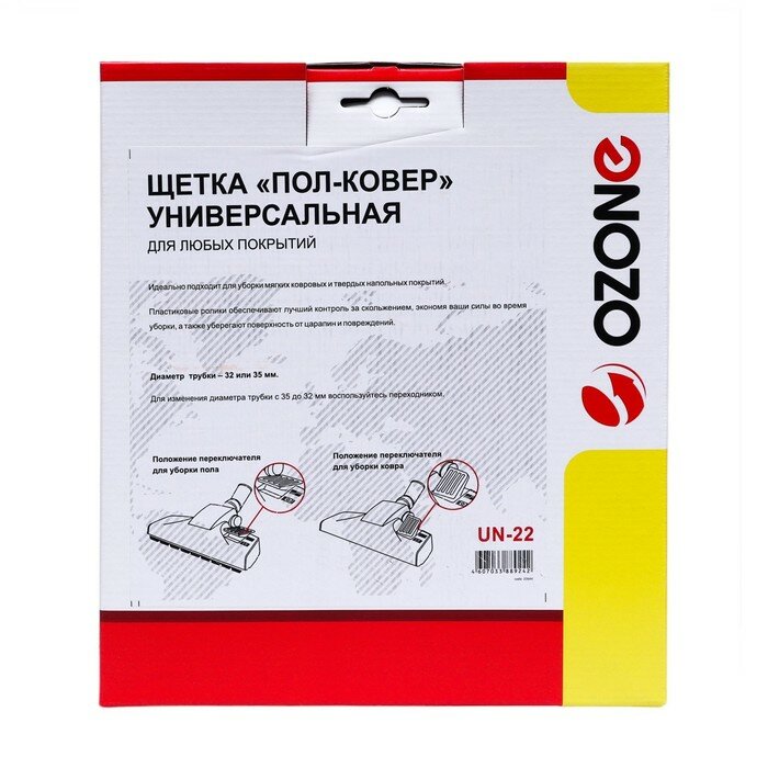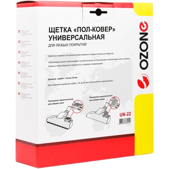 OZONE Универсальная высокоэфективная щетка "Пол-Ковер" Максимальная эфективность всасывания, удобный ножной переключатель режима работы пол-ковер, дополнительные ролики в рабочей зоне подошвы предотвращают появление царапин на паркете и ламинированных полах. Подходит для всех типов пылесосов с диаметром удлинительных трубок 32 или 35 мм., переходник в комплекте.