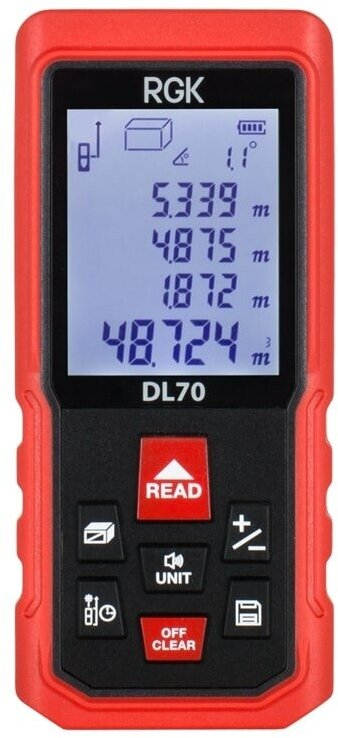 | Комплектация | Лазерный дальномер RGK DL70 - 1шт., Ремешок - 1шт., Батарейки ААА 1,5В - 3шт., Чехол - 1шт., Отражающая пластина - 1шт., Руководство по использованию - 1шт. |