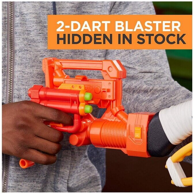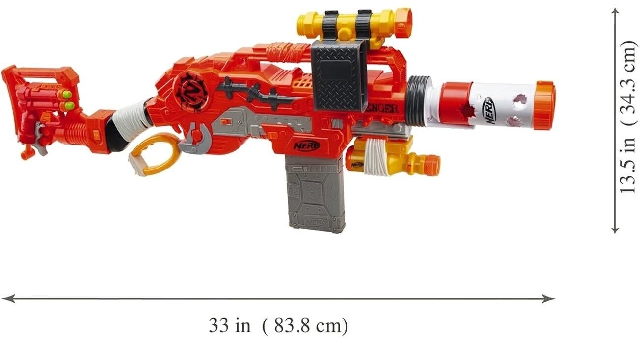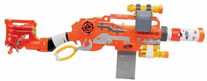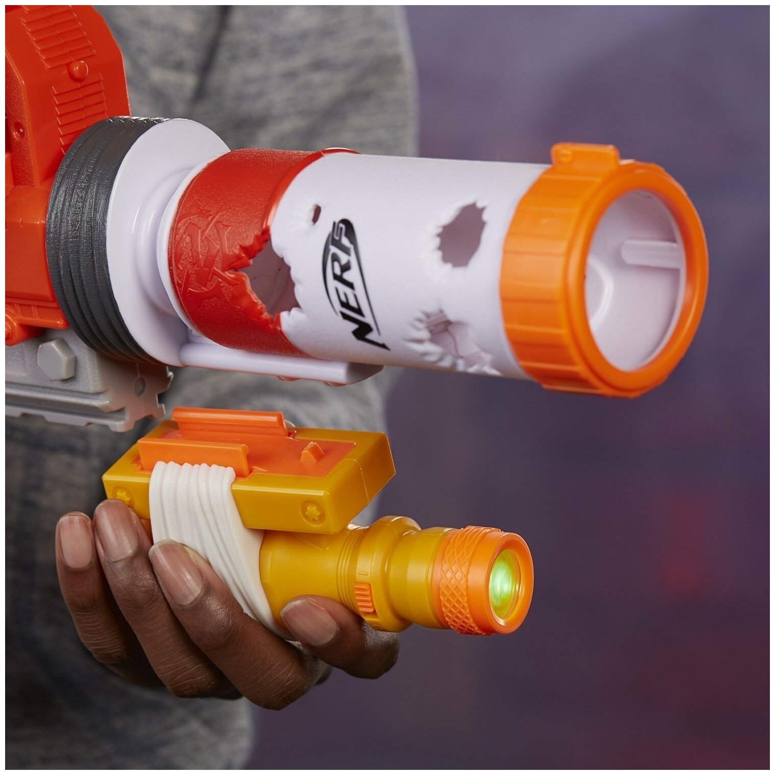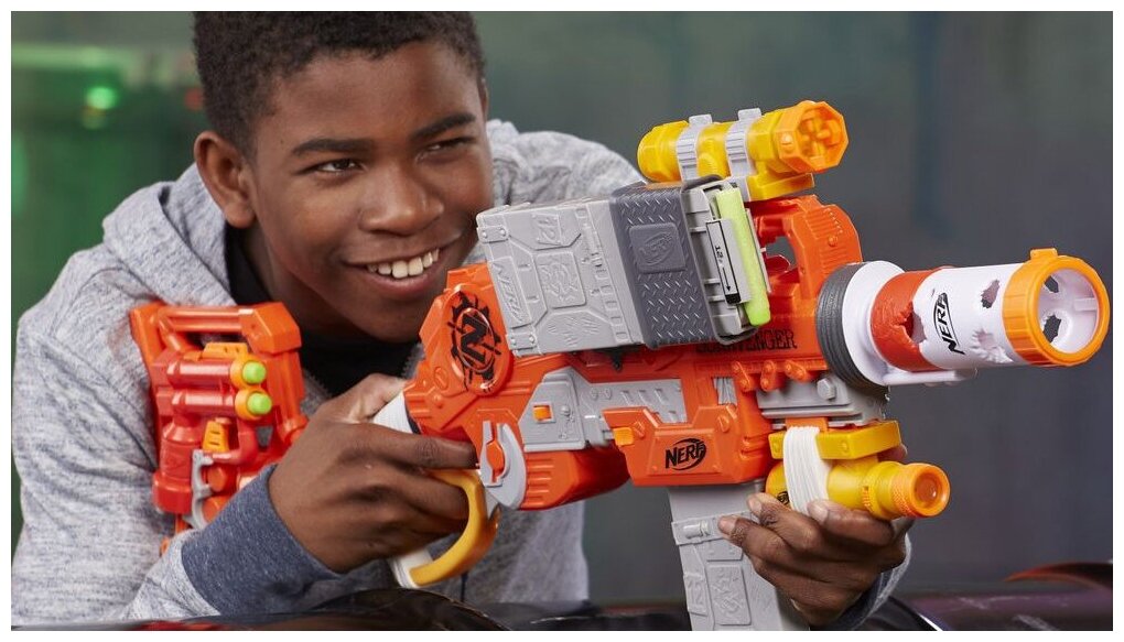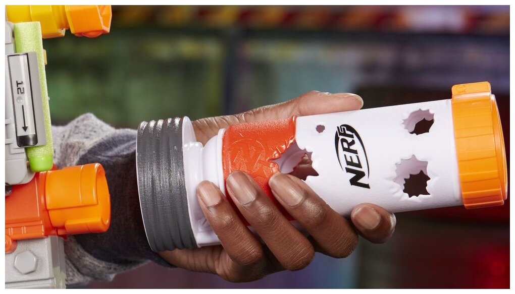 Бластер выполнен в ярко-оранжевом цвете. На его корпусе есть имитация бинтов, винтиков и прочих элементов для большей детализации и эффекта того, что он собран из различных подручных материалов. Для того чтобы выстрелить из бластера нужно предварительно заполнить обойму патронами (в комплект входят 2 обоймы вместительностью по 12 стрел), а затем тянуть рукоять для каждого выстрела. Кислотно-салатовые стрелы Нерф Элит из легкого пластика и мягких материалов. Они не травмируют в бою, и их легко найти на полу, в траве и в белом снегу. В комплект входят сразу 26 стрел. Также к бластеру прилагаются дополнительные модули: насадка, прицел, фонарик и приклад с мини-бластером на 2 стрелы. Они сделают игру еще интереснее. С таким оружием победа в бою гарантирована!
