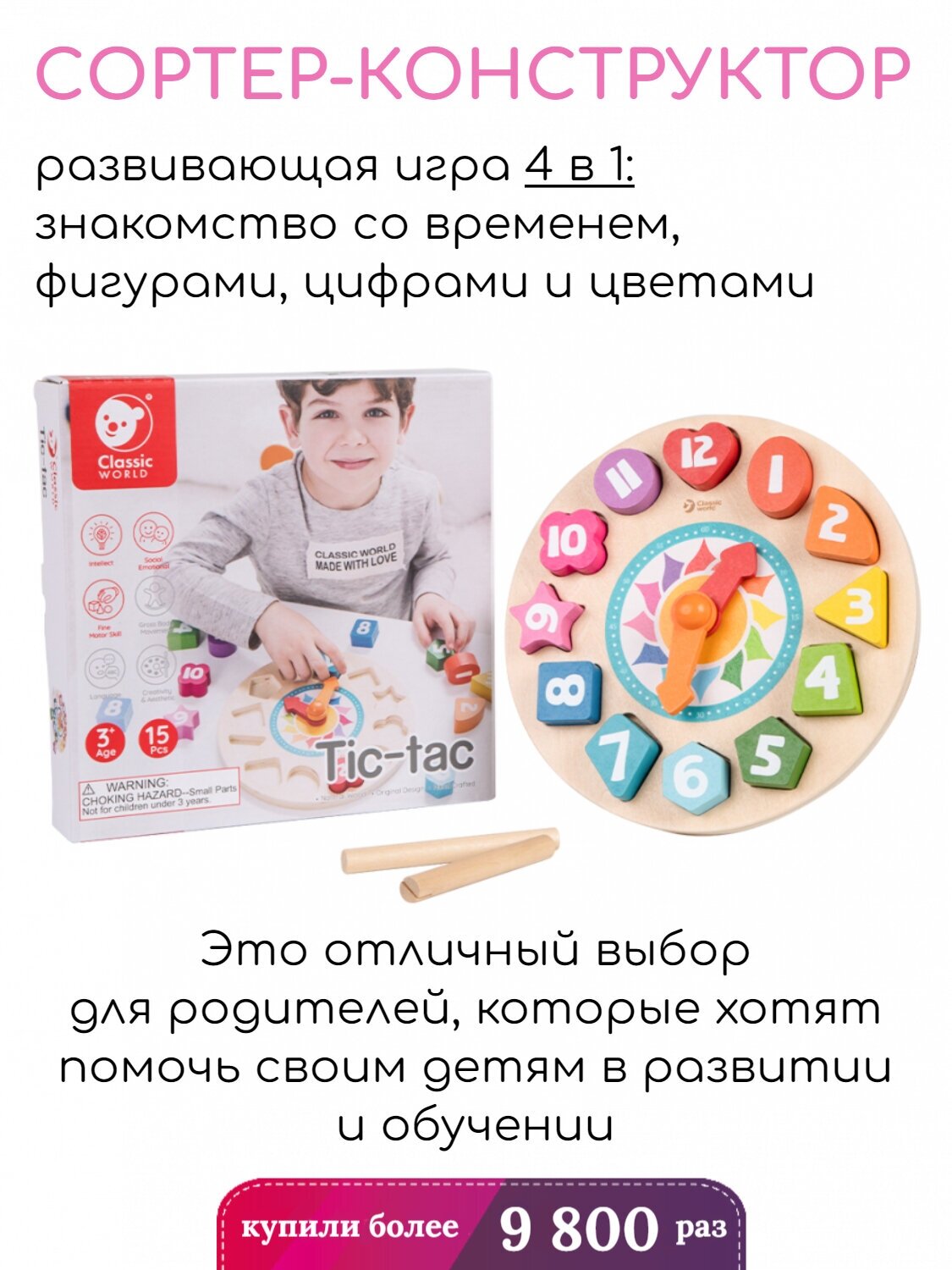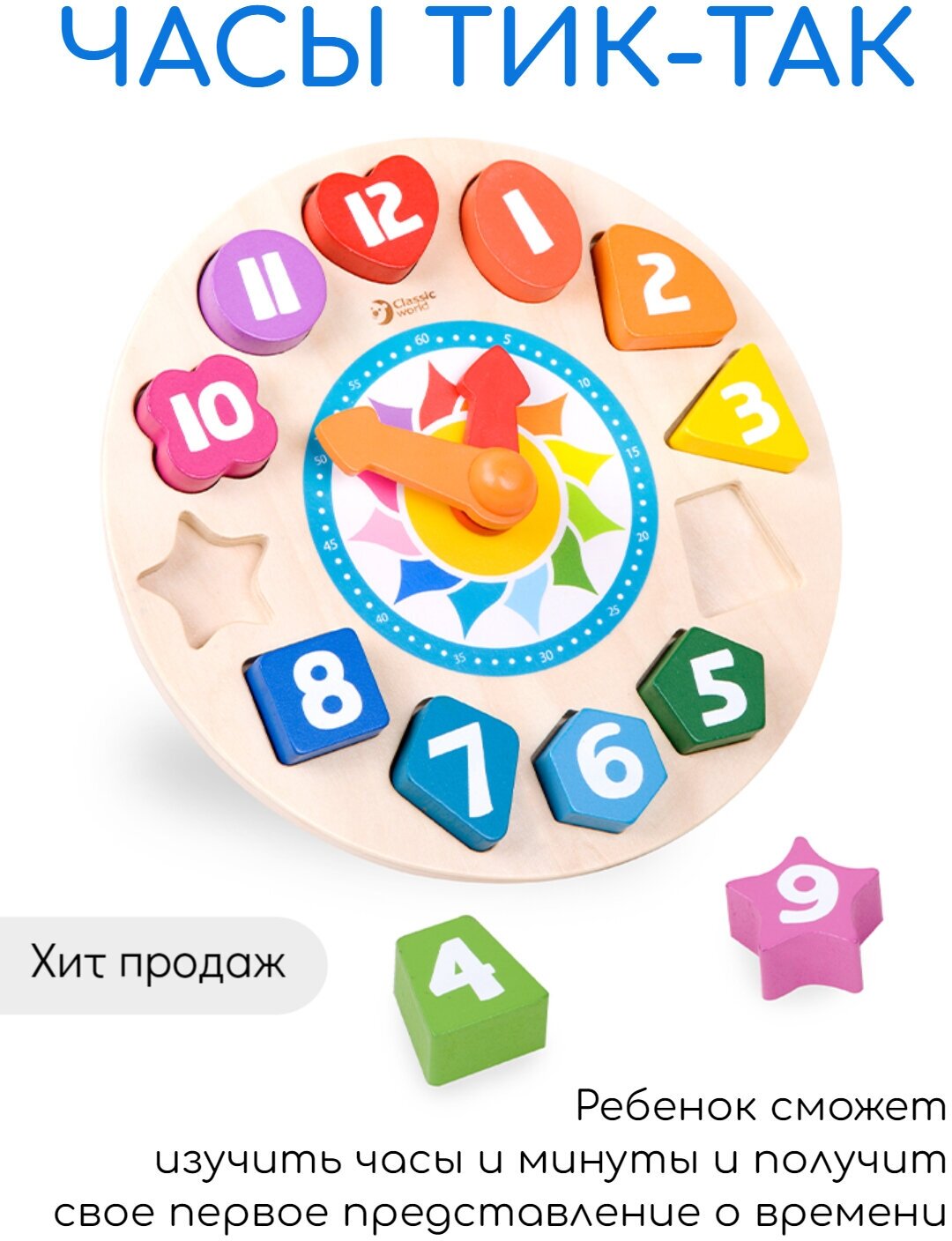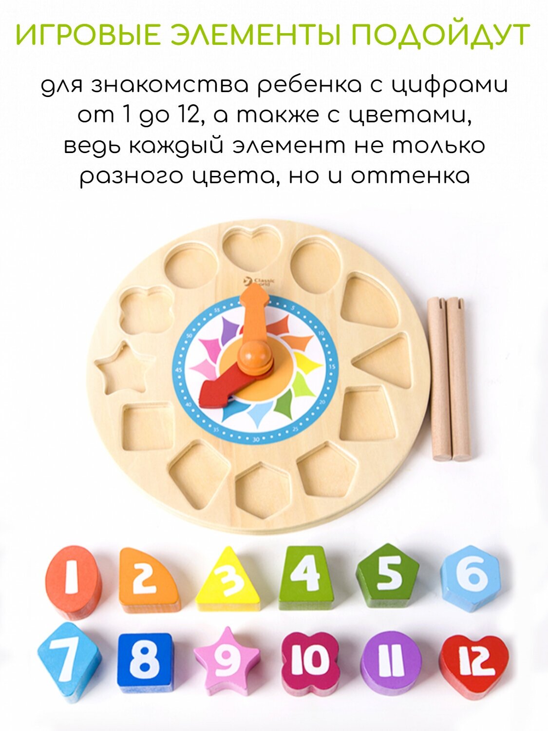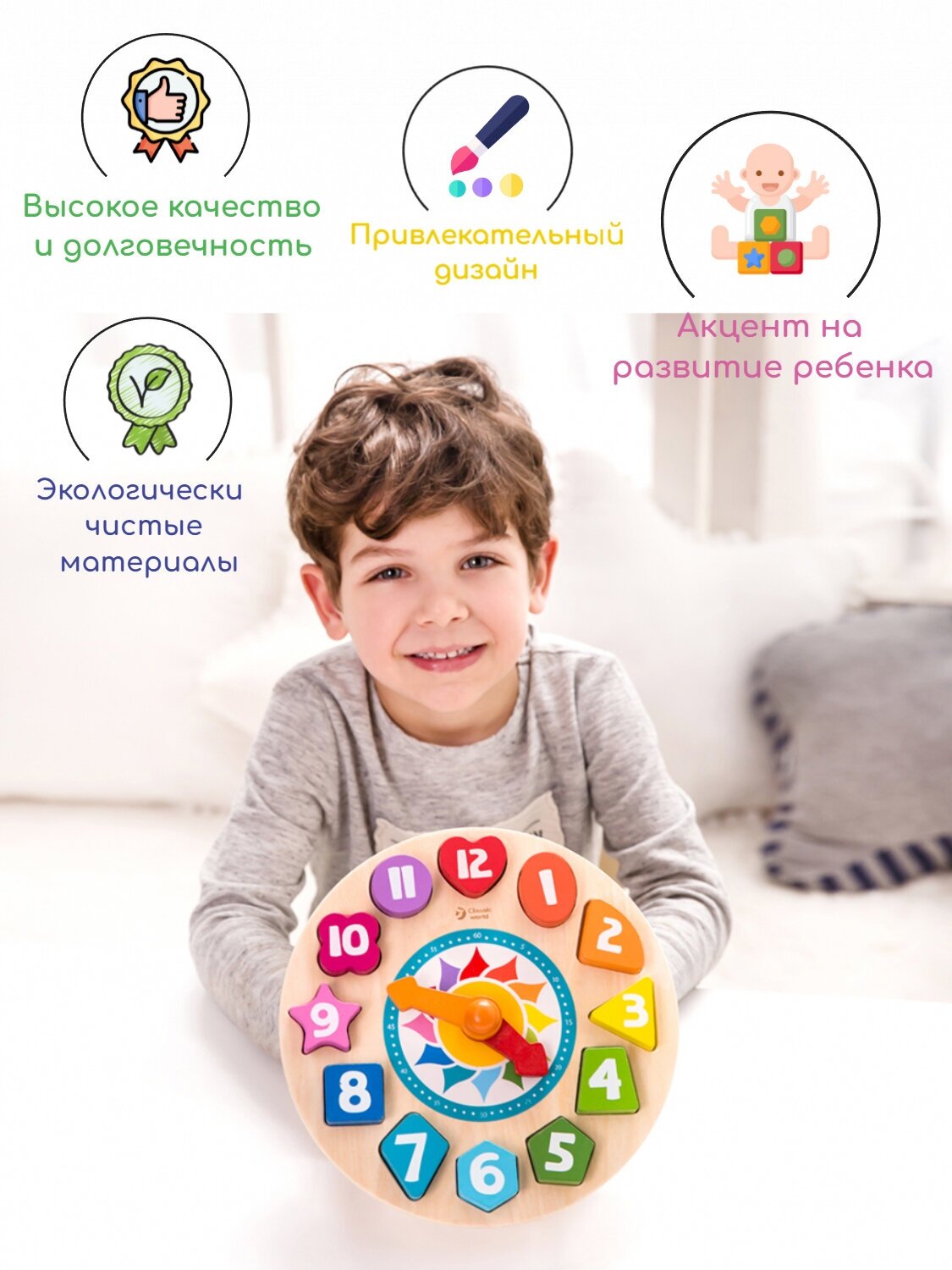 1. Увлекательный и разнообразный мир игры откроется перед вашим ребёнком вместе с уникальным игровым центром-сортером. 2. Необходимость разложить элементы по силуэтам даст возможность познакомится ребенку с разнообразными фигурами. 3. В простой и занятной игровой форме ребёнок сможет изучить часы и минуты и получит своё первое представление о времени. 4. Игровые элементы мультифункционального центра великолепно подойдут и для первого знакомства с цифрами от 1 до 12, а также с цветом, ведь каждый элемент не только разного цвета, но и оттенка. 5. Благодаря великолепной игре, соблюдение режима дня станет нескучным занятием для детей постарше, ведь такое захватывающее действие как расстановка времени согласно расписанию понравится каждому ребёнку. 6. Игрушка выполнена из высококачественных материалов, а значит вы будете уверены в безопасности Вашего ребёнка.