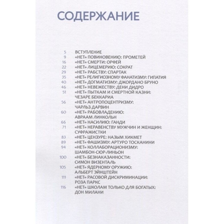 Современный мир предоставляет каждому из нас гораздо больше возможностей, чем имели люди прошлого. На протяжении тысячелетий человек жил под гнетом несправедливости, порой даже не осознавая этого. Правами и свободами, которые есть у нас сегодня, мы обязаны героям, рискнувшим своим положением, а зачастую и своей жизнью, чтобы встать на борьбу с неравенством и невежеством. Древнегреческий титан Прометей и римский гладиатор Спартак, индийский политик Ганди и английский учёный Стивен Хокинг, турецкий поэт Назым Хикмет и юная правозащитница Малала Юсуфзай – в этой книге ты найдешь истории самых разных людей – легендарных и реальных, прекрасно образованных и неграмотных, полных жизненных сил и неспособных даже двигаться, совсем юных и умудренных опытом – истории людей, которые однажды не побоялись сказать «нет». И изменили мир к лучшему! Здесь отражена вся мировая история – с древнейших времён и до наших дней, и о каждом из героев автор рассказывает ярким и образным языком, помогая читателю увидеть всех своих героев такими, какими они могли бы быть в реальной жизни, понять их идеи, стремления и чувства. Издание предназначено для читателей среднего и старшего школьного возраста.