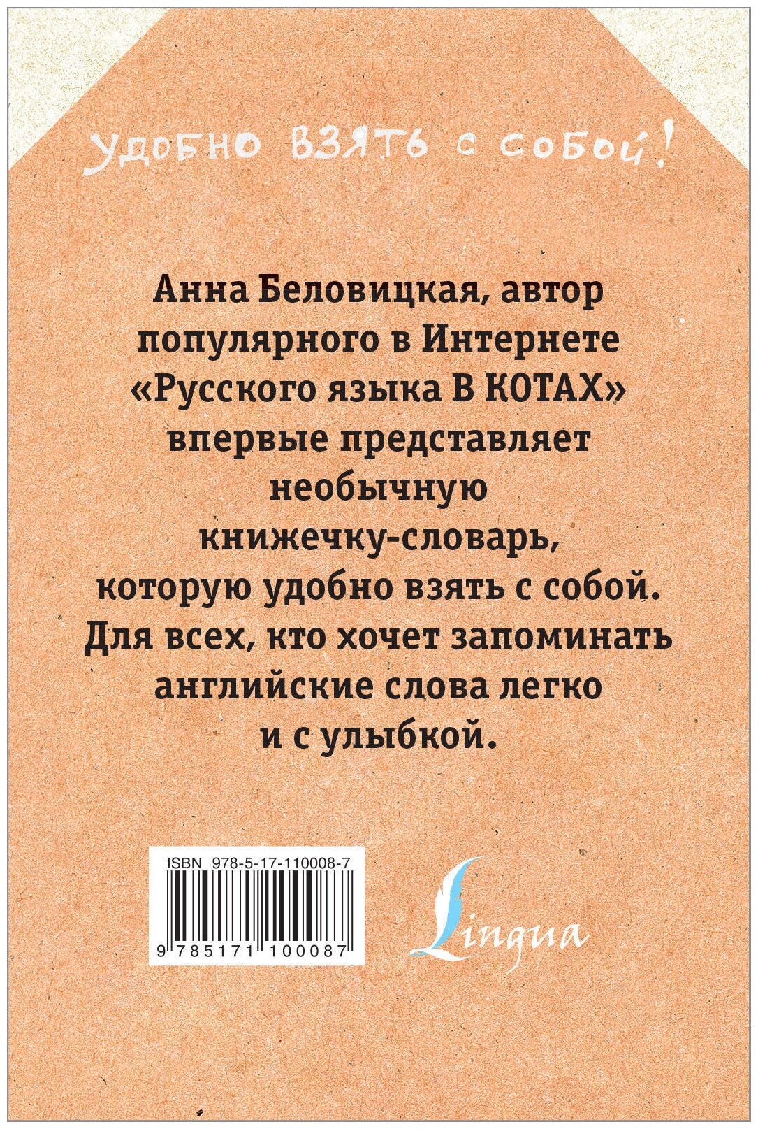 Автор популярного в Интернете "Русского языка В КОТАХ" впервые представляет необычный словарь, который удобно взять с собой в дорогу, для всех, кто хочет запоминать английские слова легко и с улыбкой. Уже знакомые всем коты приглашают вас в увлекательный мир ассоциаций, в котором не нужно ничего зубрить! Анна Беловицкая, преподаватель иностранных языков, уже более десяти лет помогает своим ученикам заучивать новую лексику, используя ассоциации - мощный механизм для запоминания новых слов.