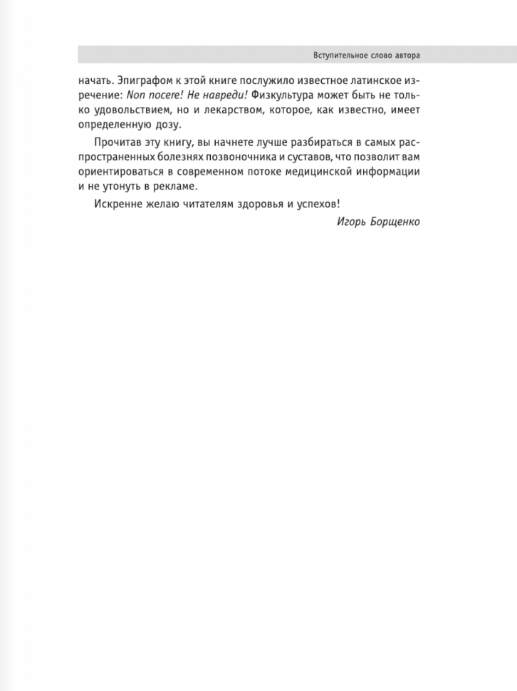 Наиболее полная книга доктора Борщенко об изометрической гимнастике. В начале даётся набор диагностических действий, чтобы определить различные проблемы тела и степень этих проблем. А затем даются упражнения для различных отделов позвоночника (причём разного уровня сложности, которые называются 1-й уровень, 2-й уровень, и 3-й уровень): поясничного, шейного, грудного, а также для многих суставов (коленного, плечевого, локтевого, тазобедренного, суставов стопы и кисти). Даются упражнения для расслабления глубоких мышц позвоночника. А также упражнения, которые можно делать в постели, автомобиле, самолёте, … Книга не просто хорошая, а очень хорошая. Множество фотографий, которые активно помогают осваивать упражнения… Очень рекомендую…