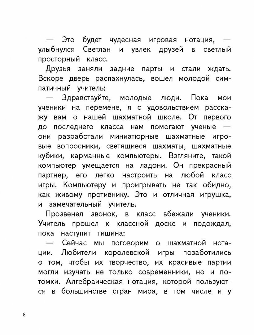 В книге шахматный материал растворен в остросюжетной фантастической сказке. Она знакомит детей с правилами игры, ее терминами, историей и секретами фигур, этикой борьбы за клетчатой доской, мифами и легендами, связанными с шахматами и входящими в сокровищницу мировой культуры.