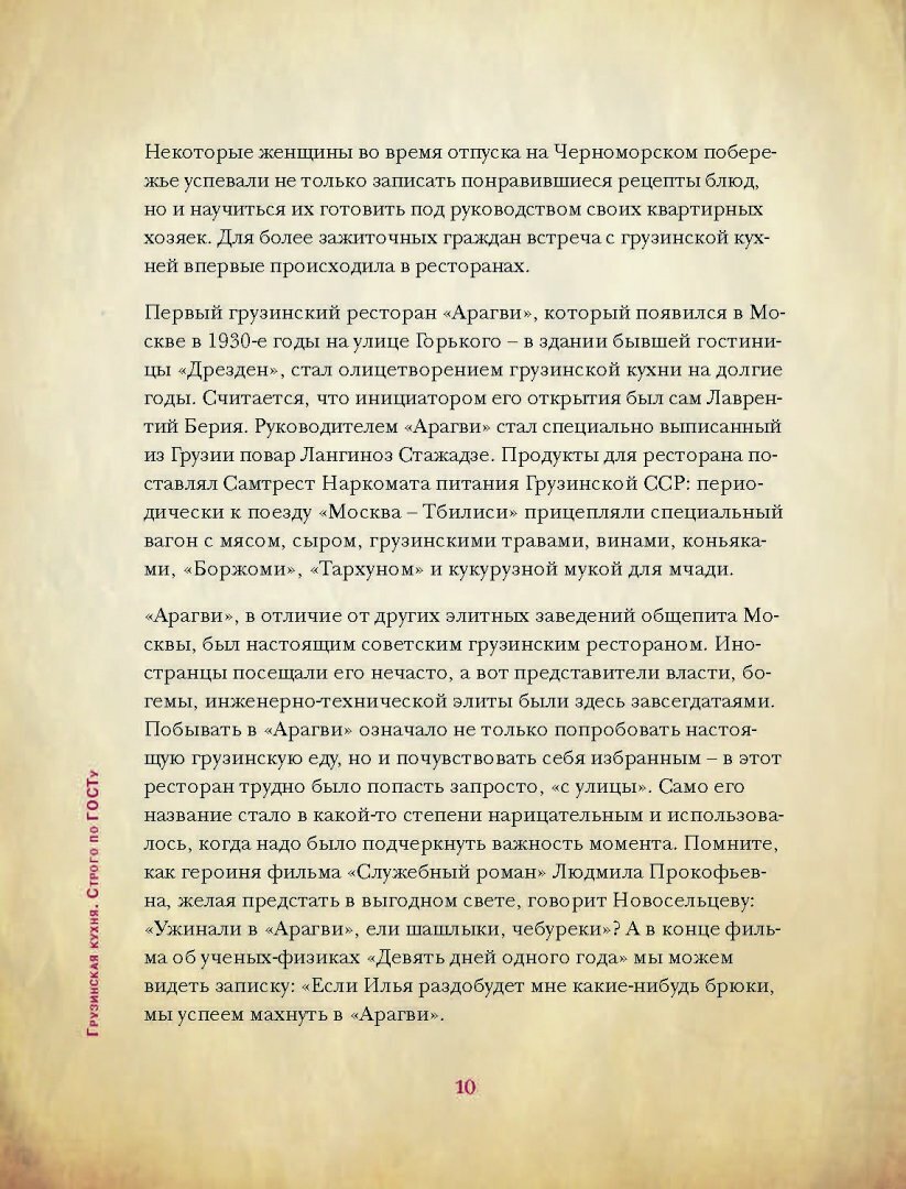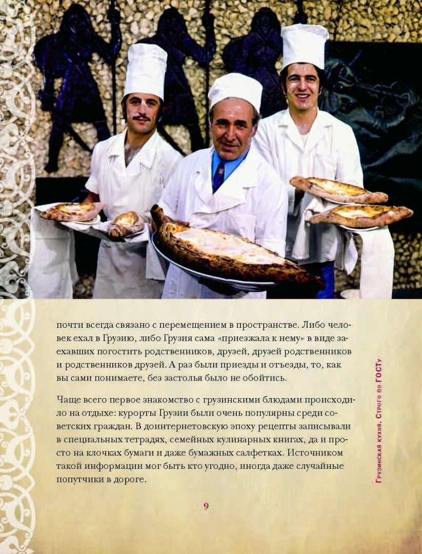 Эту книгу подрила мужу, так как кулинария - его хобби, а как съездили в Грузию, так только по грузинским рецептам и готовит. Книга ему очень нравится. Описание рецептов полное, четкое, с отступлениями в воспоминания об СССР, что навевает ностальгию, приятно окунуться в прошлое. Кника наполнена множеством фотографий, и не только блюд, а и людей СССР, событий СССР, быта СССР и др. Книга похожа на учебник истории в фотографиях и с рецептами. Описано 50 рецептов - от закусок до десертов. Рецепты самые основные, расхожие. Книга хорошая, а как подрок - замечательная.