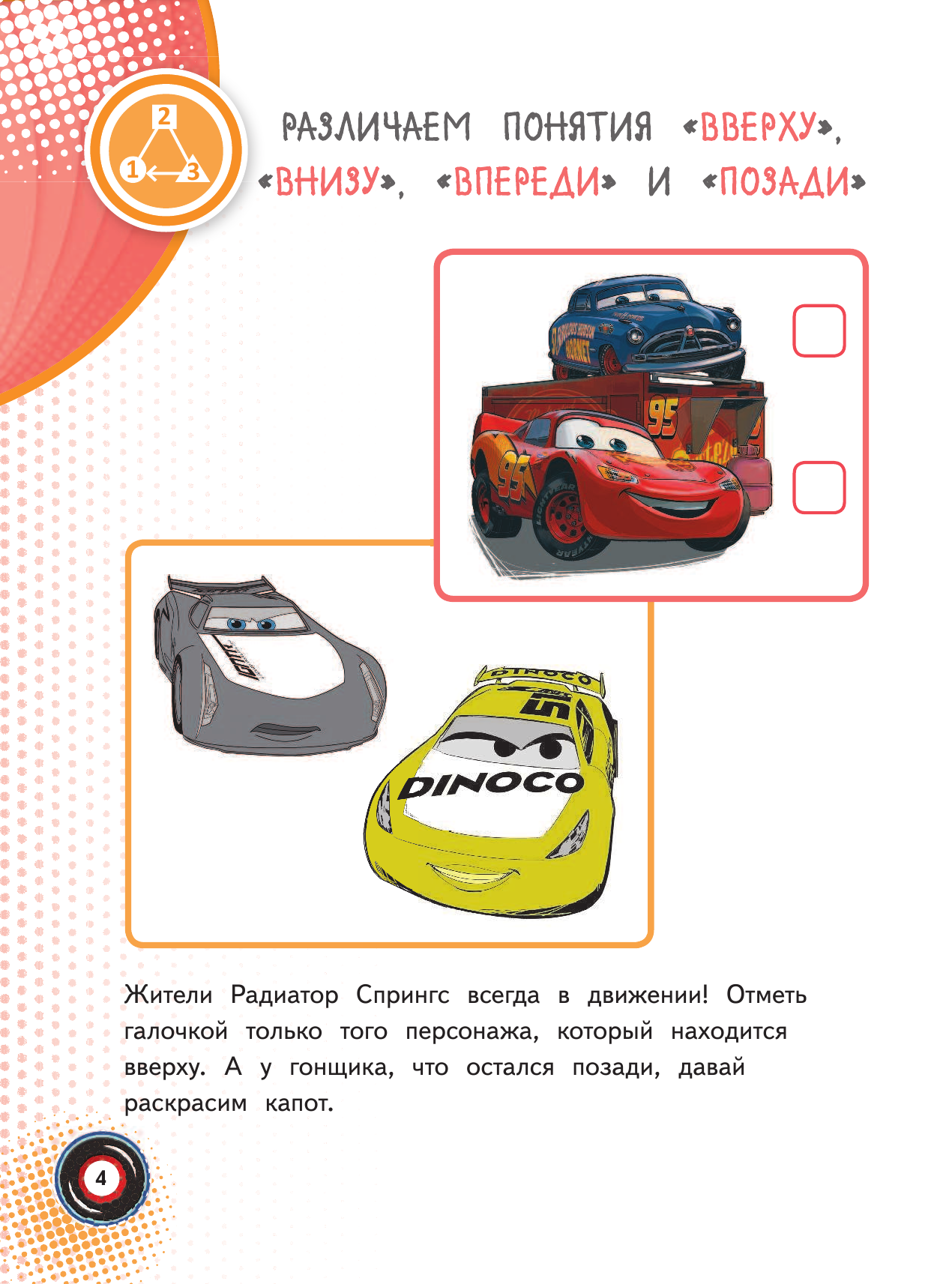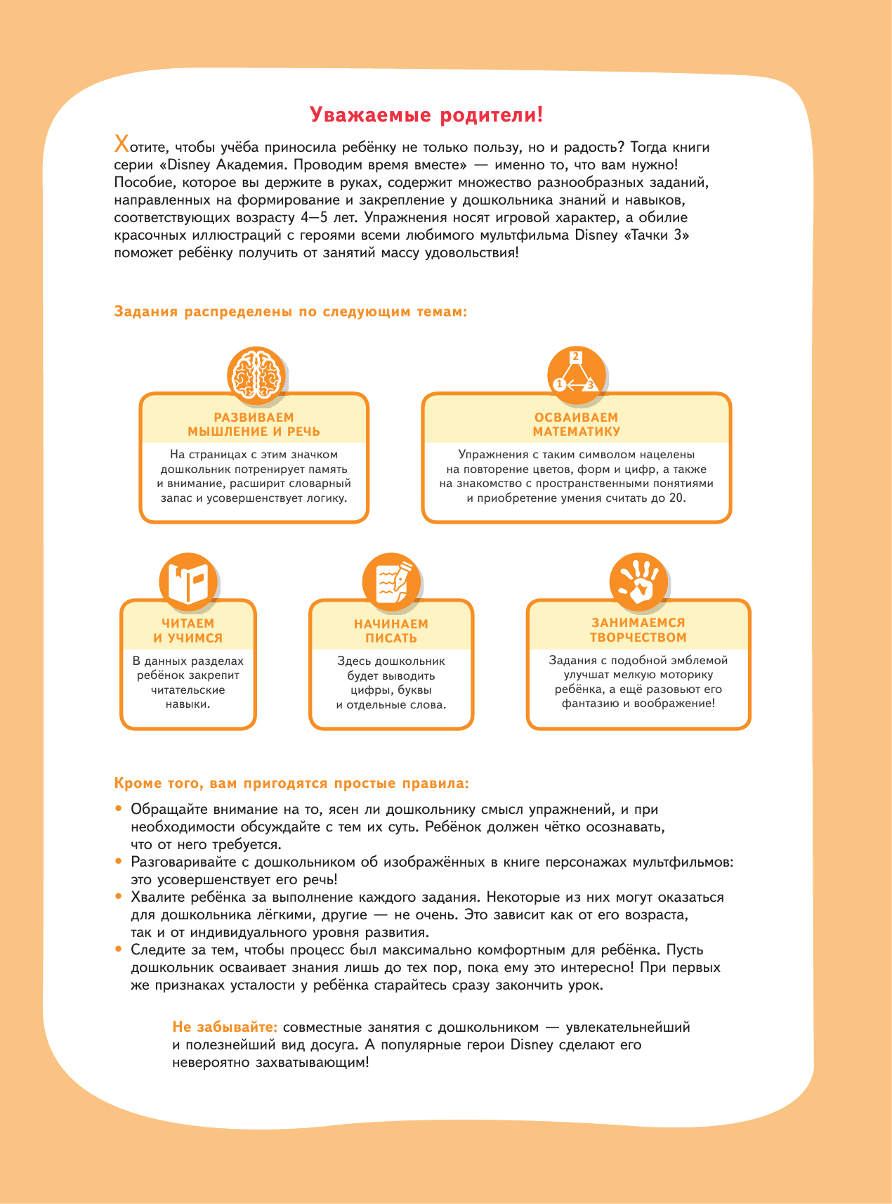 Эта книга содержит множество разнообразных заданий, направленных на формирование и закрепление у дошкольника знаний, умений и навыков, соответствующих возрасту 4-5 лет. Упражнения носят игровой характер, а обилие красочных иллюстраций с героями популярного мультфильма Disney "Тачки 3" поможет ребёнку получить от занятий массу удовольствия!