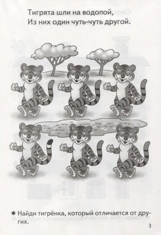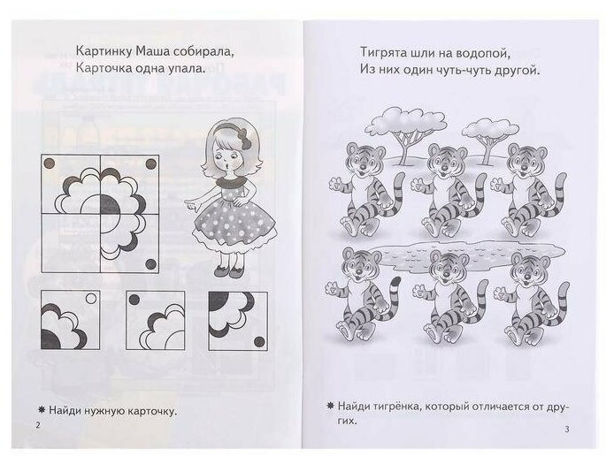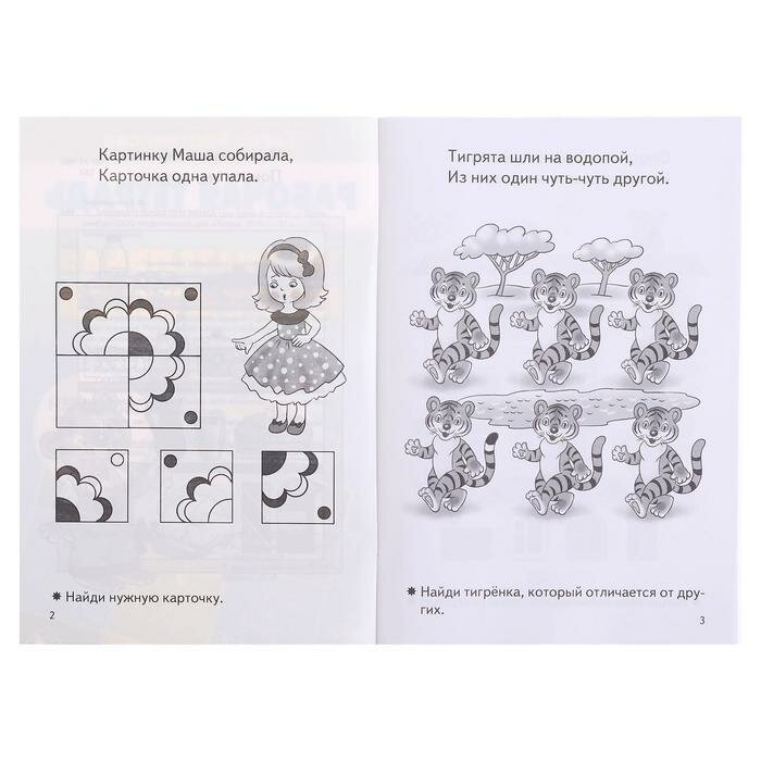 Заметила, что моей доке нравятся всякие лабиринты и задания на логику. Купила эту книгу. нам она очень нравится. Задания для моей дочери не сложные. Несмотря на черно-белые картинки, занимается по тетради с большим удовольствием. Задания в книге разнообразные - найти на картинке предмет, подобрать недостающий фрагмент, найти отличия, пройти лабиринт, найти тень. На каждой странице одно задание. Для меня это большой плюс. вверху страницы есть стихотворение, в котором загадано задание. Внизу страницы поясняется, сто нужно сделать. например. Рано утром у реки Что поймали рыбаки? Какую рыбу поймал каждый ребенок.