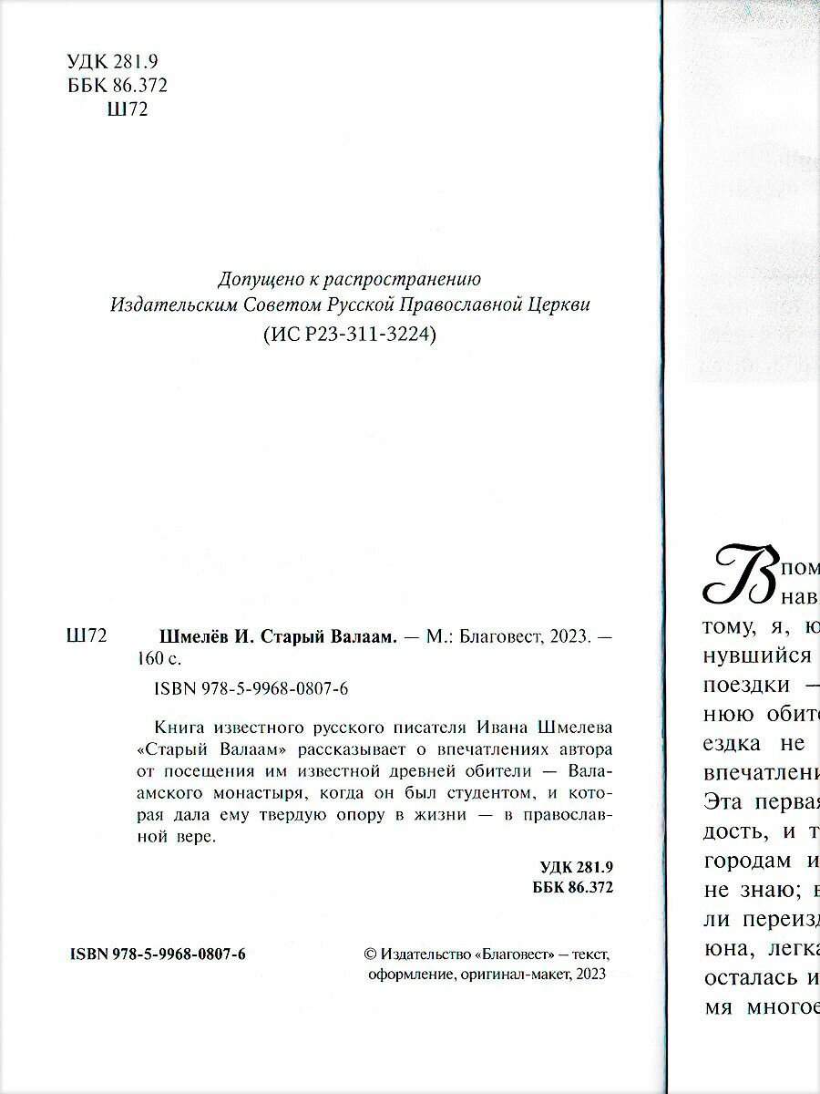 О, Иване Сергеевиче Шмелёве и его творениях, в том числе и "Старый Валаам", можно писать много и только хорошее. Напишу непосредственно, о издание. Книга тонкая, мягкая обложка, качественная печать, плотные, белые, непросвечивающие листы, очень качественная, добротная склейка. Сверху в начале глав, есть маленькая иллюстрация, она повторяется. Мне издание очень понравилось, хотя я не очень люблю мягкие обложки.