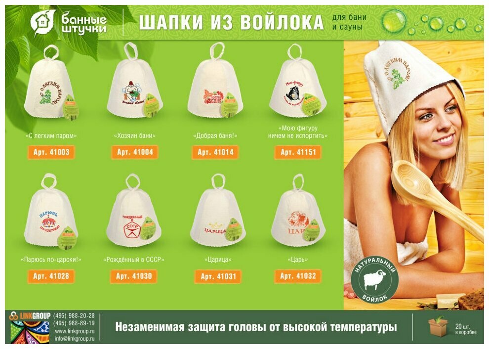 Шапка из войлока убережет Вашу голову от повышенной температуры, создавая свой микроклимат. Разнообразие вышивок позволит угодить даже очень требовательным запросам поклонников бани или сауны. Шапка из войлока долговечна, прекрасно сохраняет форму, устойчива к стирке и деформации.
