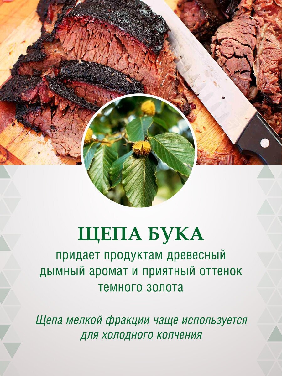 Предназначение: Буковая щепа отлично подходит для копчения рыбы, сыров и мяса. Наиболее часто используется производителями мясных копченых деликатесов. Приготовленные на буковой щепе продукты обладают приятным глазу оттенком темного золота.