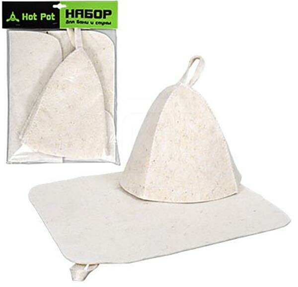 Набор для бани HOT POT бежевый () будет уместен в качестве стартового варианта для бани или подарка. Коврик защитит вас от термических ожогов, а также от инфекций и грибка. Шапка необходима для защиты от термических ожогов, теплового удара и чрезмерного испарения жидкости. Сделаны из 100% войлока.
