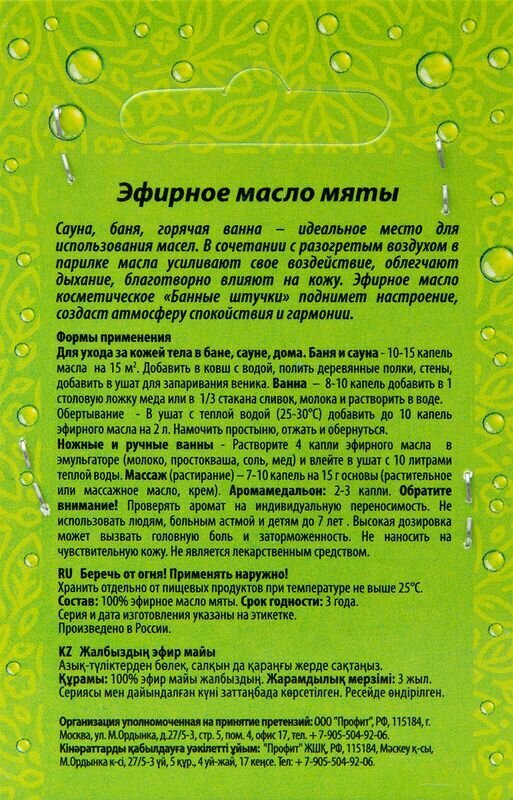 | Состав | натуральное эфирное масло мяты |