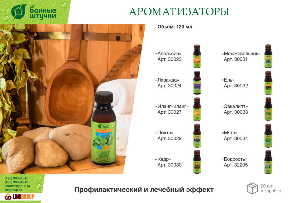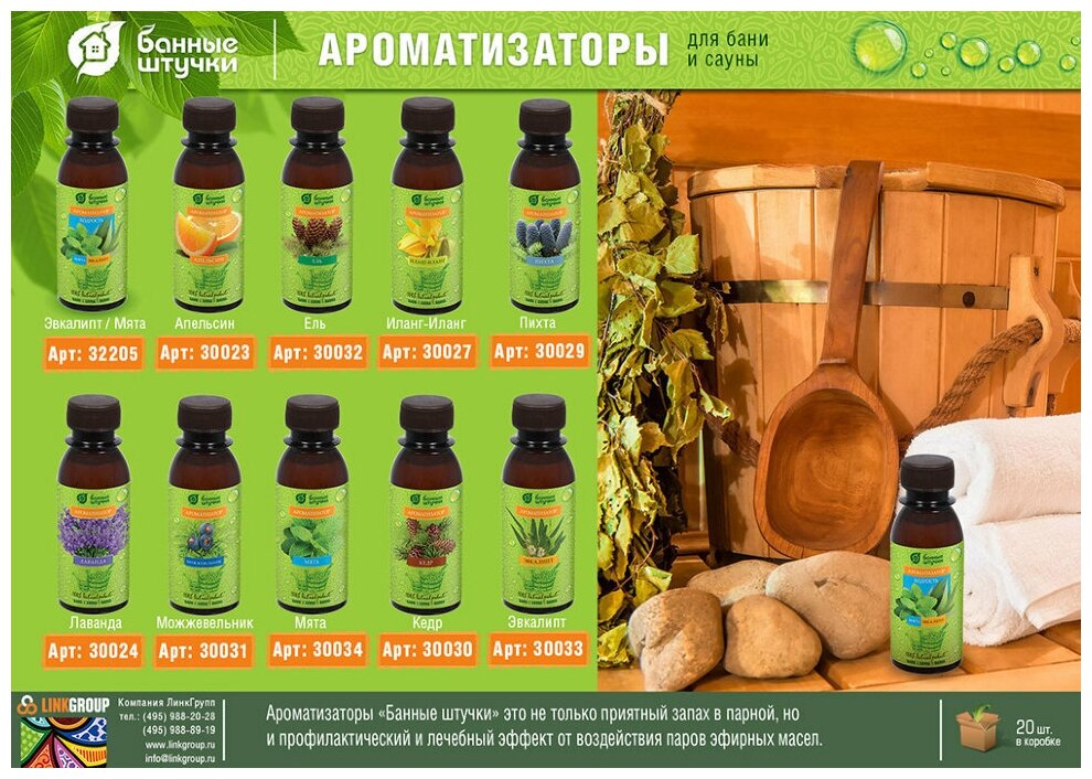 | Прочие особенности и свойства | Ароматизатор Банные штучкиповышает удовольствие от времяпрепровождения в бане или сауне, а также помогает максимально расслабиться и получить наивысший эффект от такого вида отдыха. Вы ощутите насколько мягким он сделает воздух. |